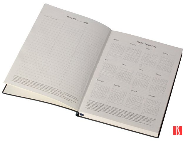 Бумажный блок выполнен из бумаги, полученной из древесины из специальных восполняемых лесных ресурсов, имеет сертификат FSC, международной некоммерческой организации лесного попечительского совета. Линовка — недатированный ежедневник, а на первых страницах вы встретите специальные листы для постановки целей на год и подведения итогов, а также другие трекеры.