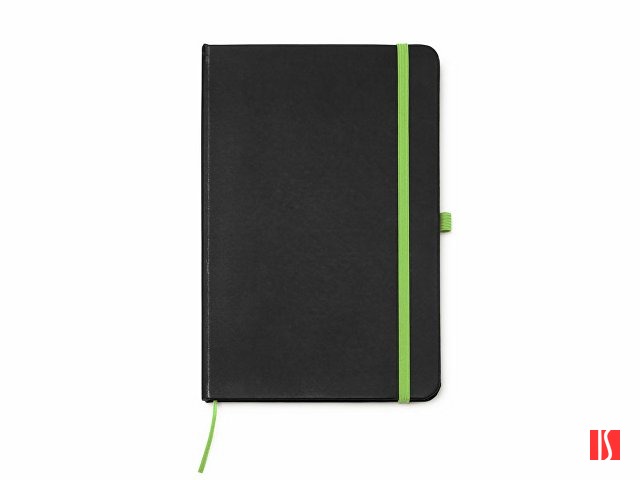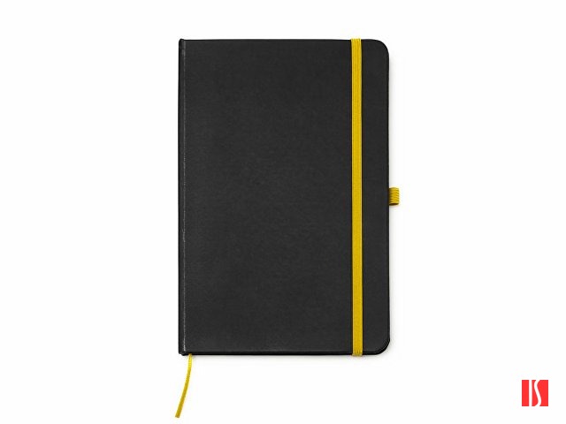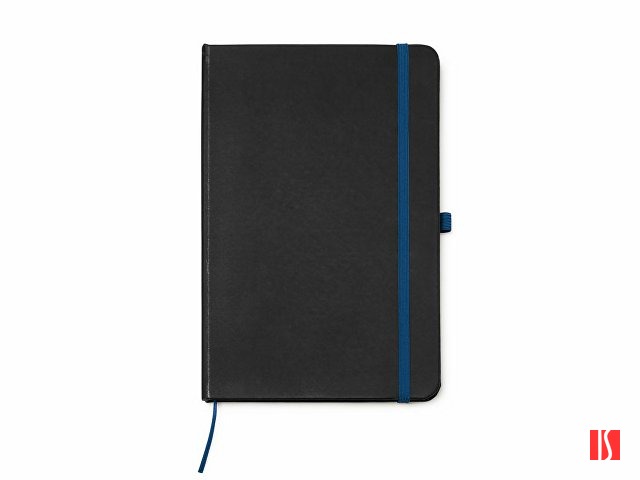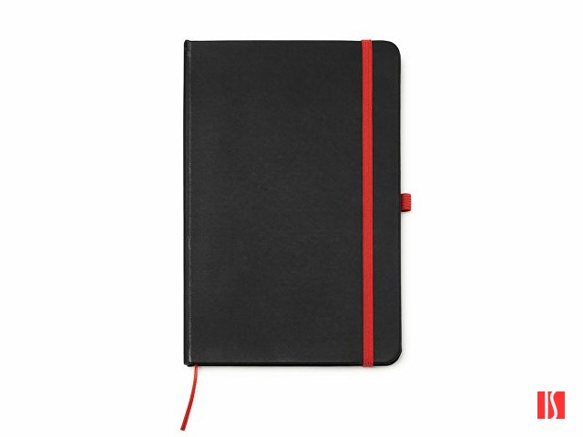 Блокнот формата А5 в твердой обложке из черного полиуретана. Цветная закладка, резинка и держатель для ручки. 80 листов в линейку. Заказать с нанесением логотипа от компании «Синтезис».