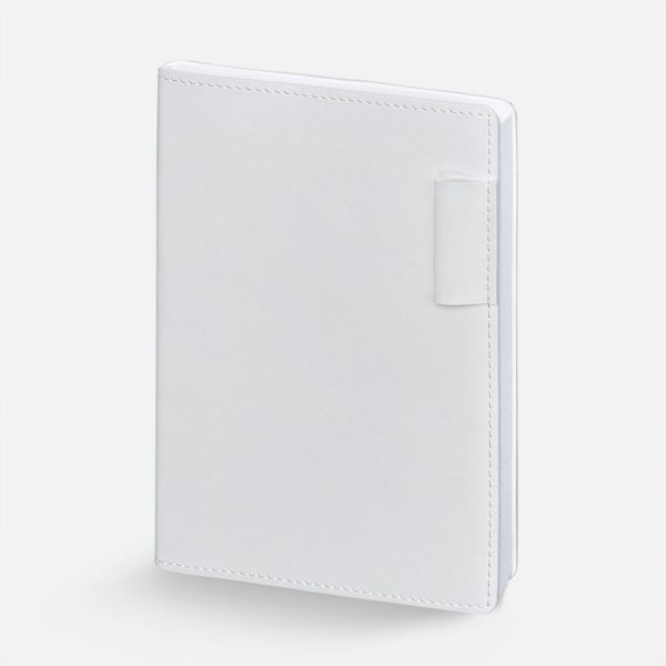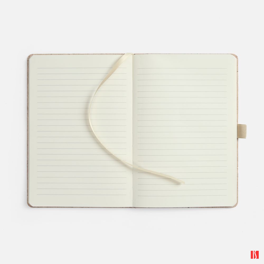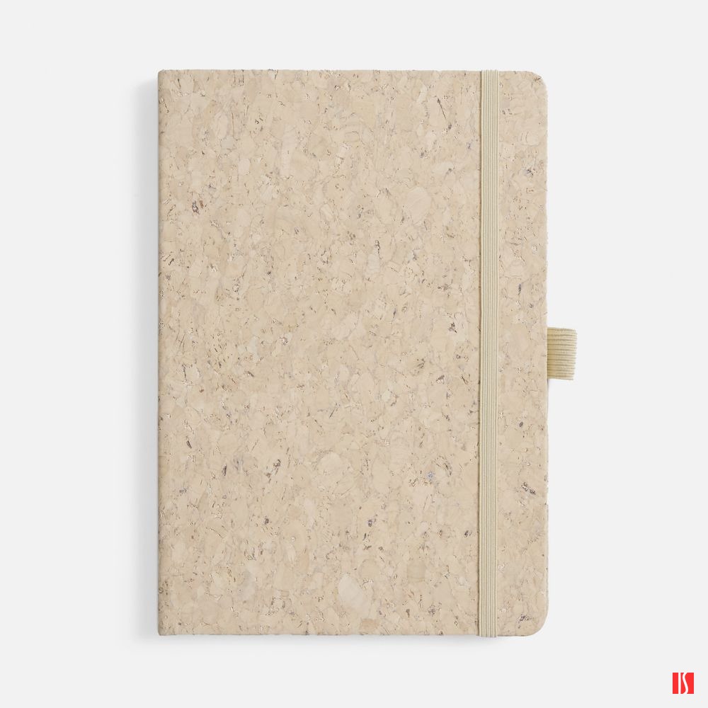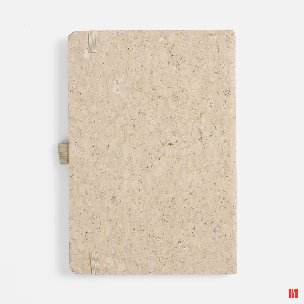 Блокнот с твердой обложкой из натуральной окрашенной пробки, дополнен петлей-резинкой для ручки, ляссе и резинкой в цвет обложки.