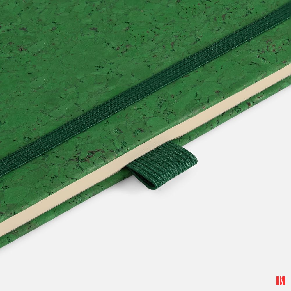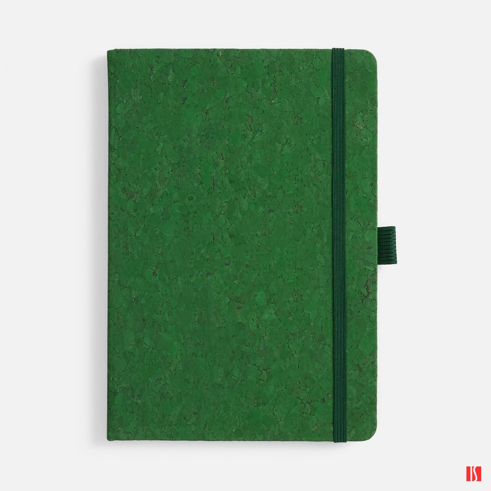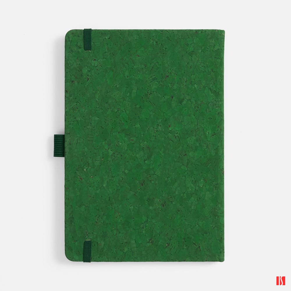 Блокнот с твердой обложкой из натуральной окрашенной пробки, дополнен петлей-резинкой для ручки, ляссе и резинкой в цвет обложки.