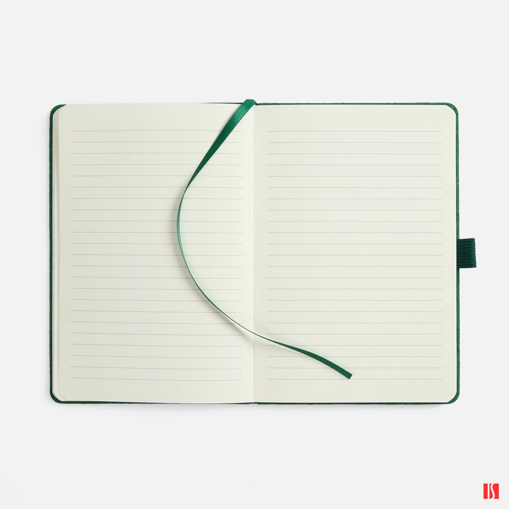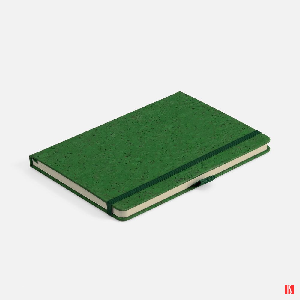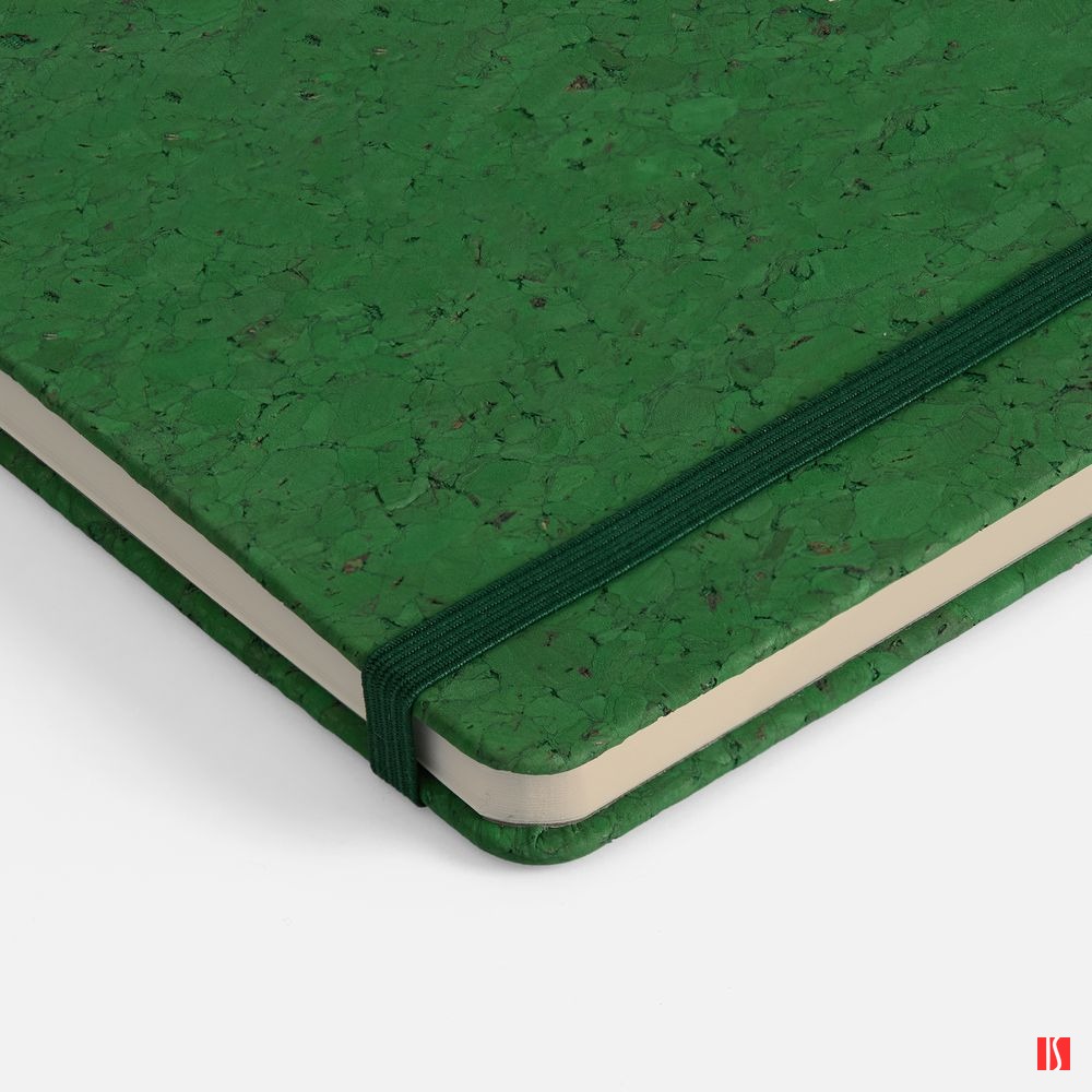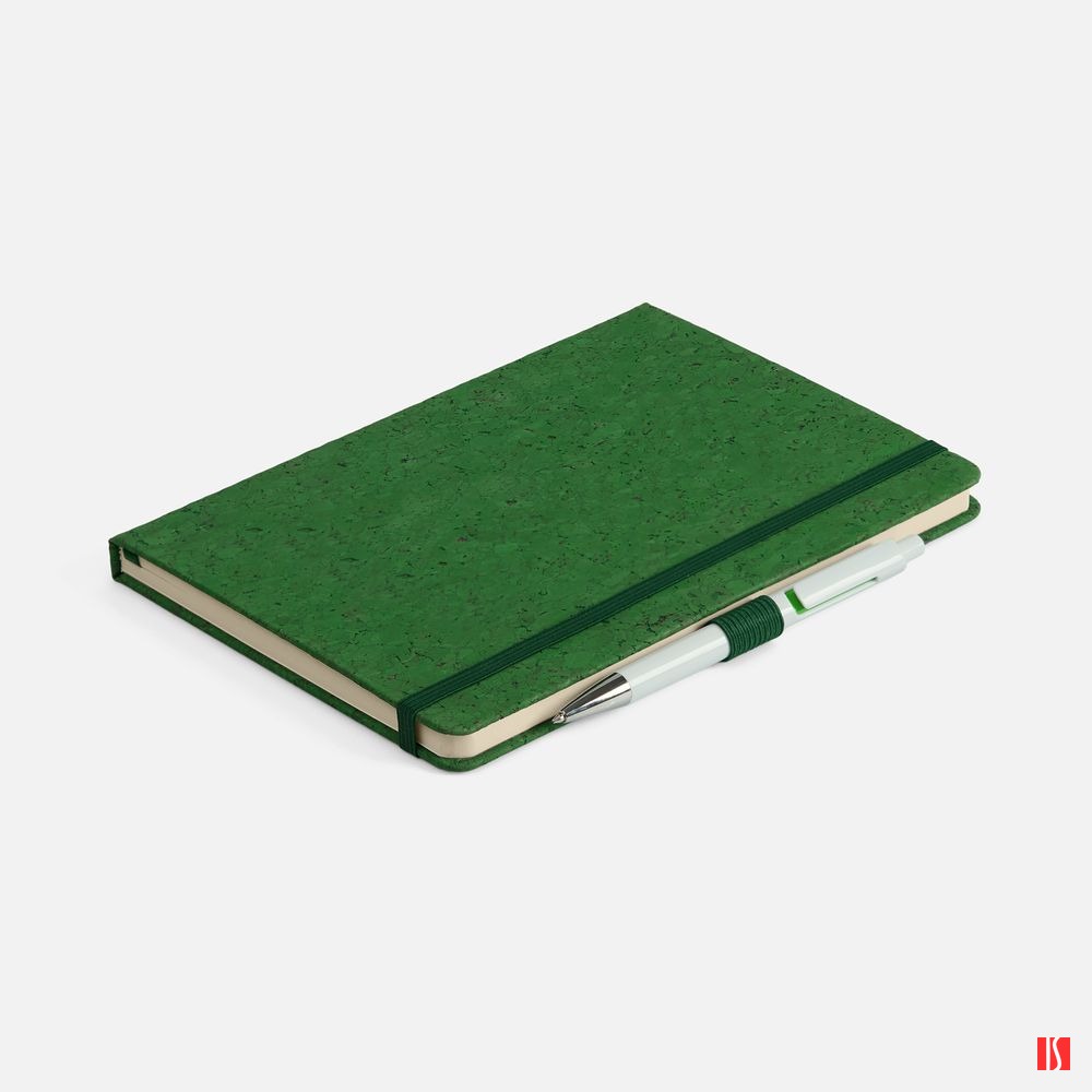 Блокнот с твердой обложкой из натуральной окрашенной пробки, дополнен петлей-резинкой для ручки, ляссе и резинкой в цвет обложки.