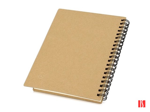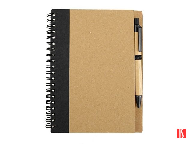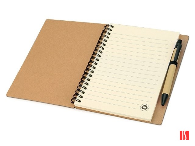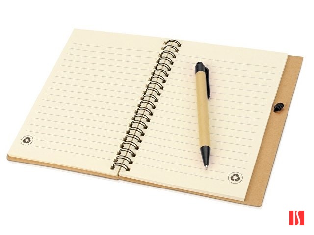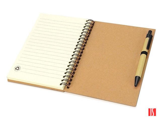 Блокнот с 60 листами переработанной бумаги 70 г/м2 и картонной ручкой в цвет блокнота. Заказать с нанесением логотипа от компании «Синтезис».