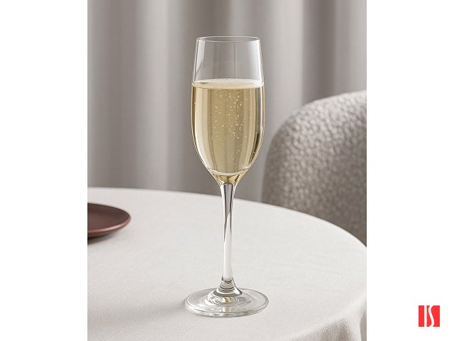 Заказать с нанесением логотипа от компании «Синтезис». Классический бокал для шампанского выполнен из минерального стекла. Его легко мыть, он впишется в любой интерьер и сервировку, а также может стать частью вашего бара или ресторана. Форма этого бокала также называется флют — она специально рассчитана для игристых вин, не давая аромату слишком быстро улетучиваться вместе с пузырьками.