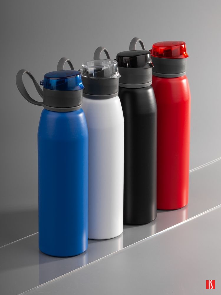 Легкая бутылка для спорта с откидной крышкой и силиконовой петлей для удобной транспортировки.