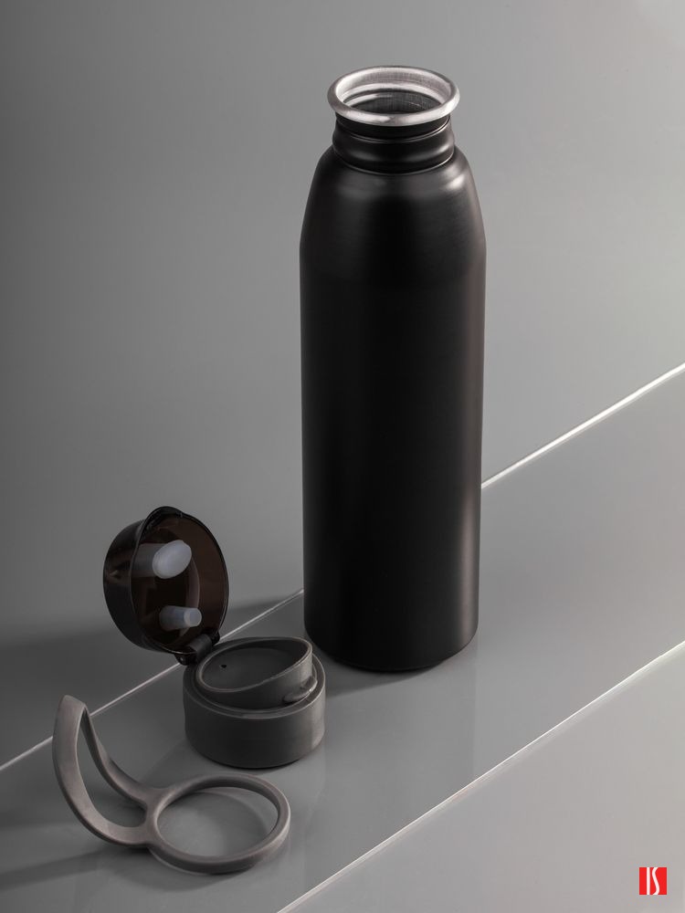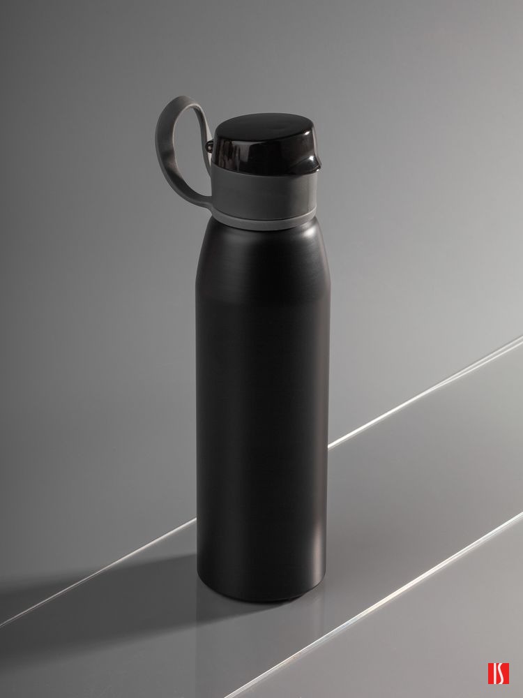 Легкая бутылка для спорта с откидной крышкой и силиконовой петлей для удобной транспортировки.