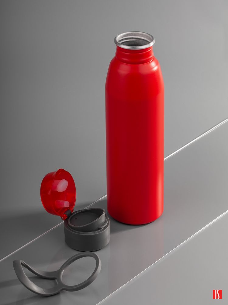 Легкая бутылка для спорта с откидной крышкой и силиконовой петлей для удобной транспортировки.