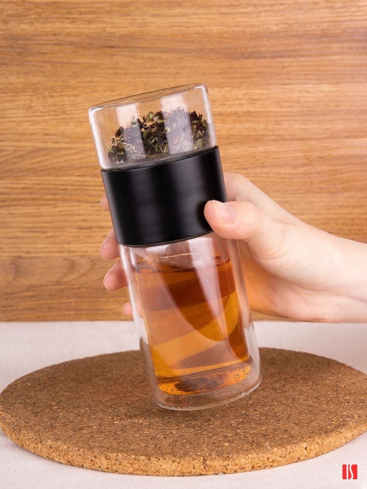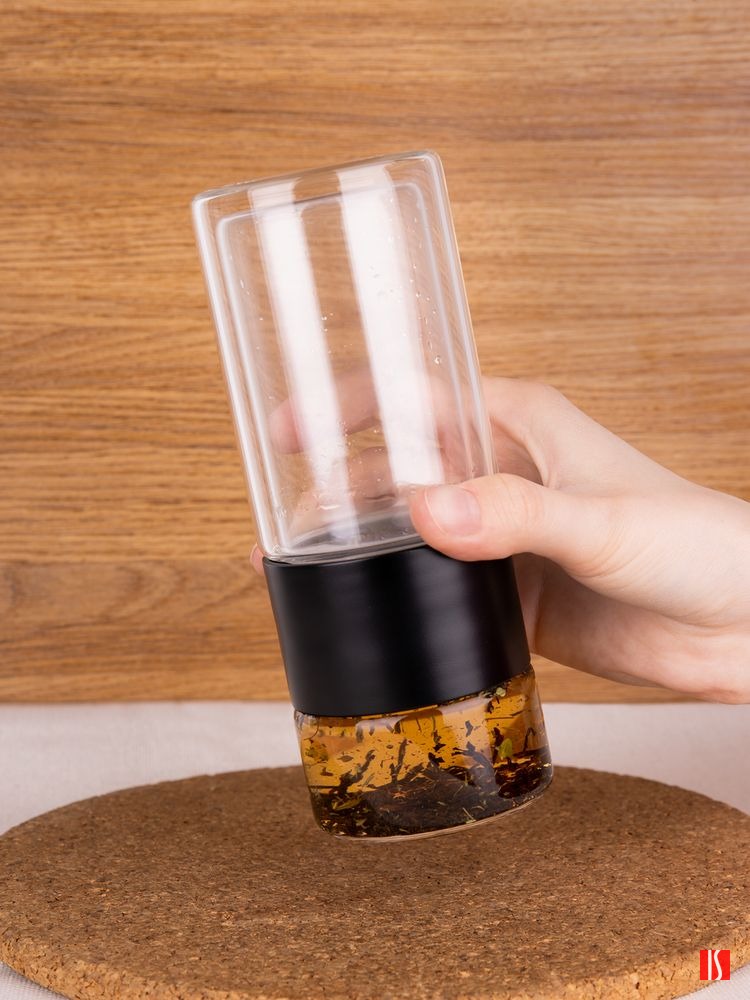 Благодаря конструкции с двумя отсеками, разделенными сетчатым фильтром, можно остановить процесс заваривания в любой момент — просто перевернув бутылку. Так настой не получится слишком крепким, а чайный лист получится залить кипятком еще несколько раз, имитируя традиционный способ заваривания проливами. Объема получившегося напитка как раз хватит на стандартную офисную кружку (около 300 мл).