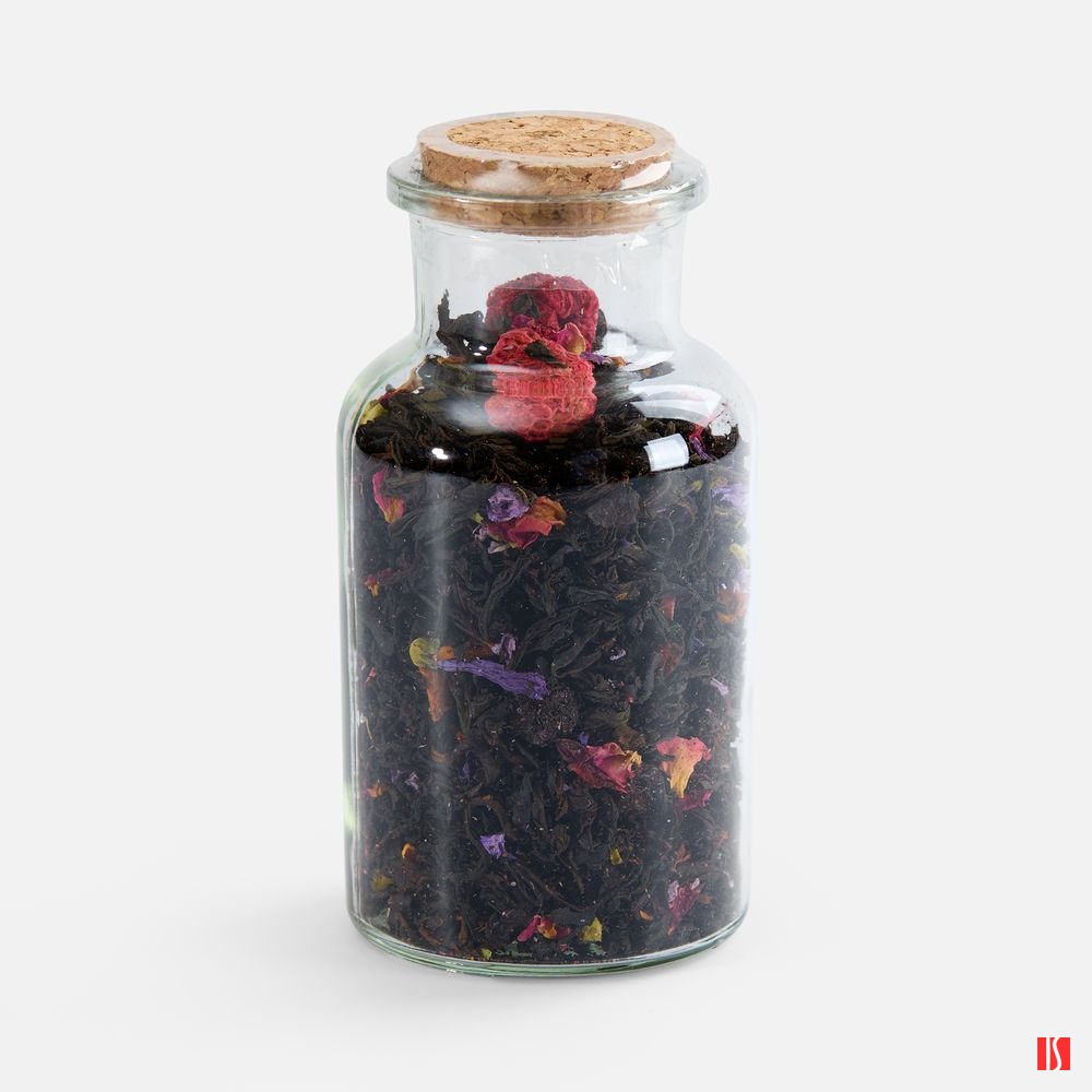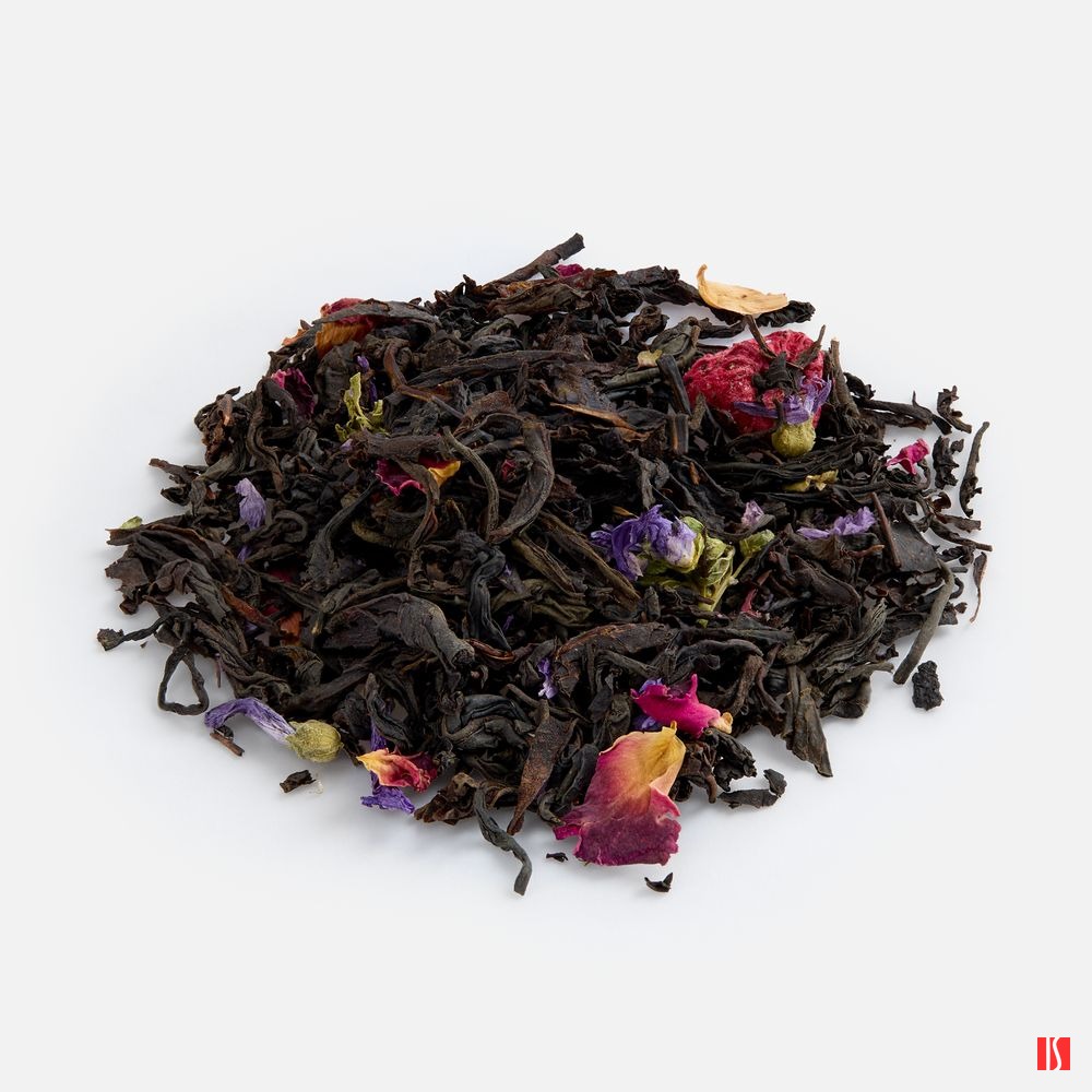 Насыщенный черный чай гармонично сочетается с бархатистой сладостью сушеной вишни и нежной кислинкой сублимированной малины. Лепестки роз и цветки мальвы добавляют напитку изысканные цветочные ноты, создающие ощущение летнего сада.