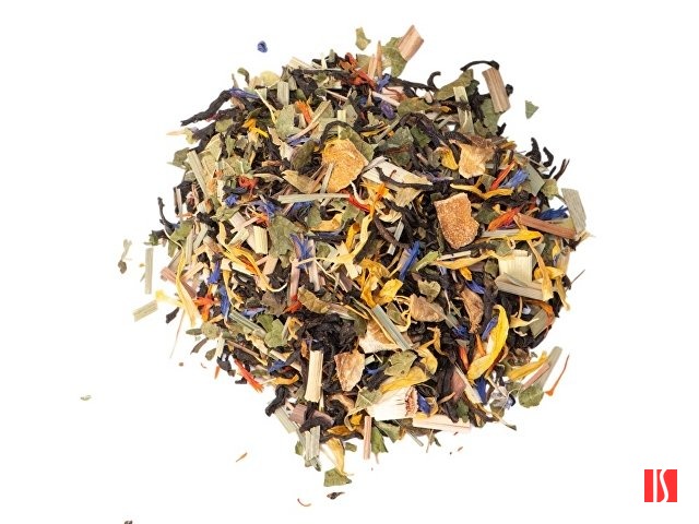 - состав сбора: чай чёрный индийский листовой, смородина лист, лимонная трава, цедра лимона, лепестки василька, лепестки календулы, липа цвет, ежевика лист, лепестки сафлора, мята, имбирь;