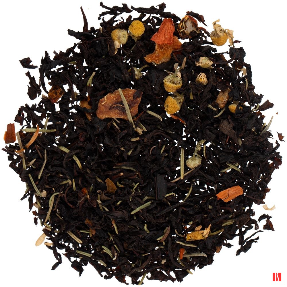 Черный индийский чай с сушеными травами, облепихой и апельсиновой цедрой имеет богатый вкус и насыщенный сладкий аромат с хвойными нотками.Состав: чай черный крупнолистовой, розмарин, цедра апельсина, цветки ромашки, ягоды облепихи, цветки лилии, пищевой ароматизатор «Апельсин».