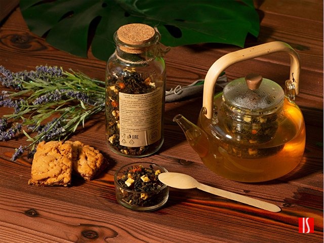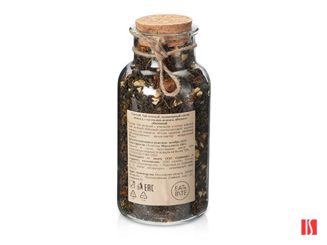 Состав: чай зелёный с ананасом и соком ананаса (чай зелёный байховый крупнолистовой, кусочки ананаса, сок ананаса), яблоко сушеное, облепиха сублимированная, ароматизатор натуральный "Яблоко". Заказать с нанесением логотипа от компании «Синтезис».