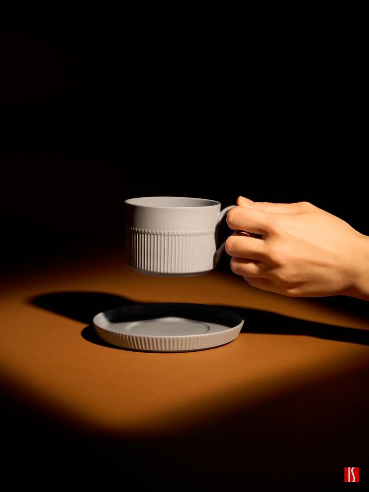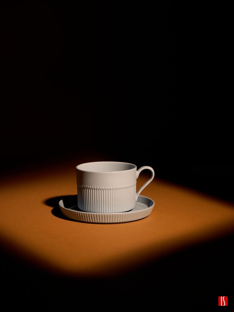 Орнамент корпуса кружки и высокого бортика блюдца напоминает изящные каннелюры — вертикальные желобки на колонне. Это добавляет всему изделию изысканности и стилистической завершенности, благородства и античной строгости.