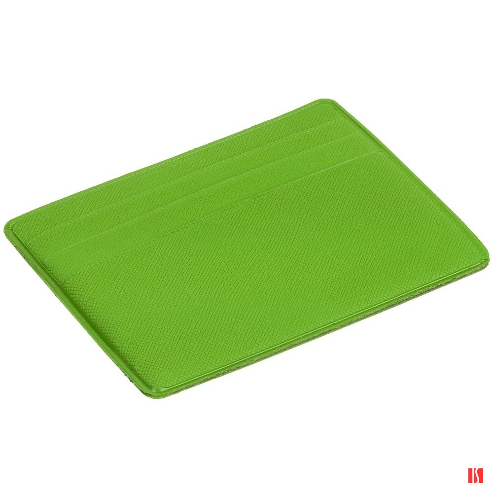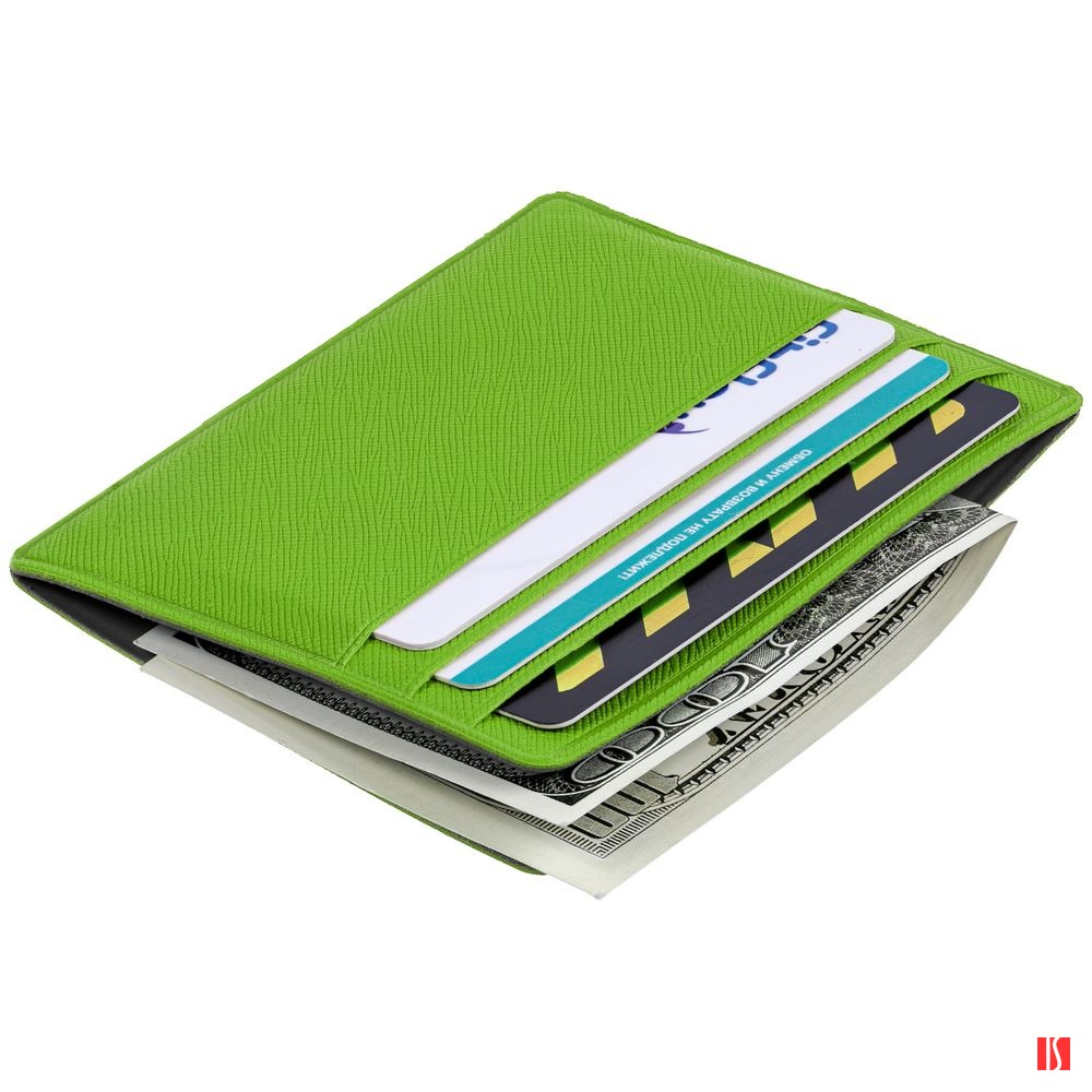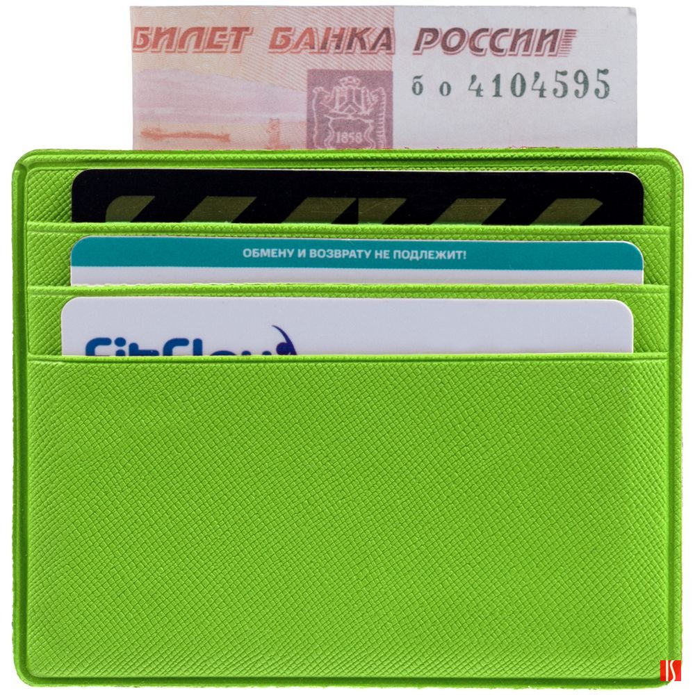Чехол для карточек из искусственного материала, имитирующего сафьяновую кожу, с шестью отделениями для кредитных карт и одним — для сложенных купюр. Заказать с нанесением логотипа от компании «Синтезис».