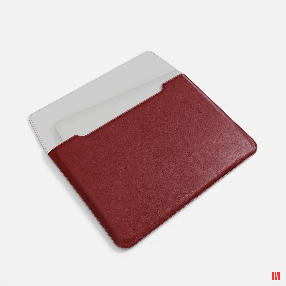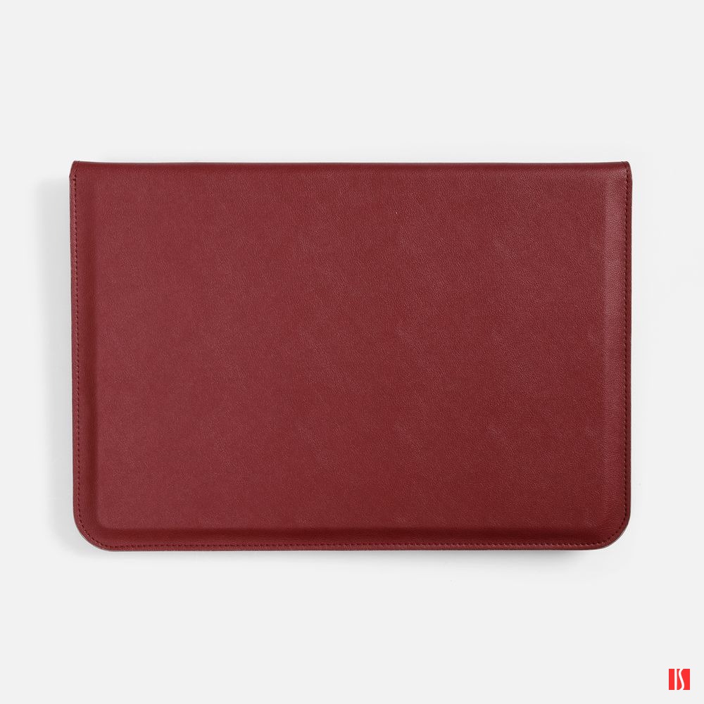 Чехол для ноутбука с диагональю до 15,6 выполнен из материала Petrus, красного цвета, дополнен окрашенным срезом края серого цвета.