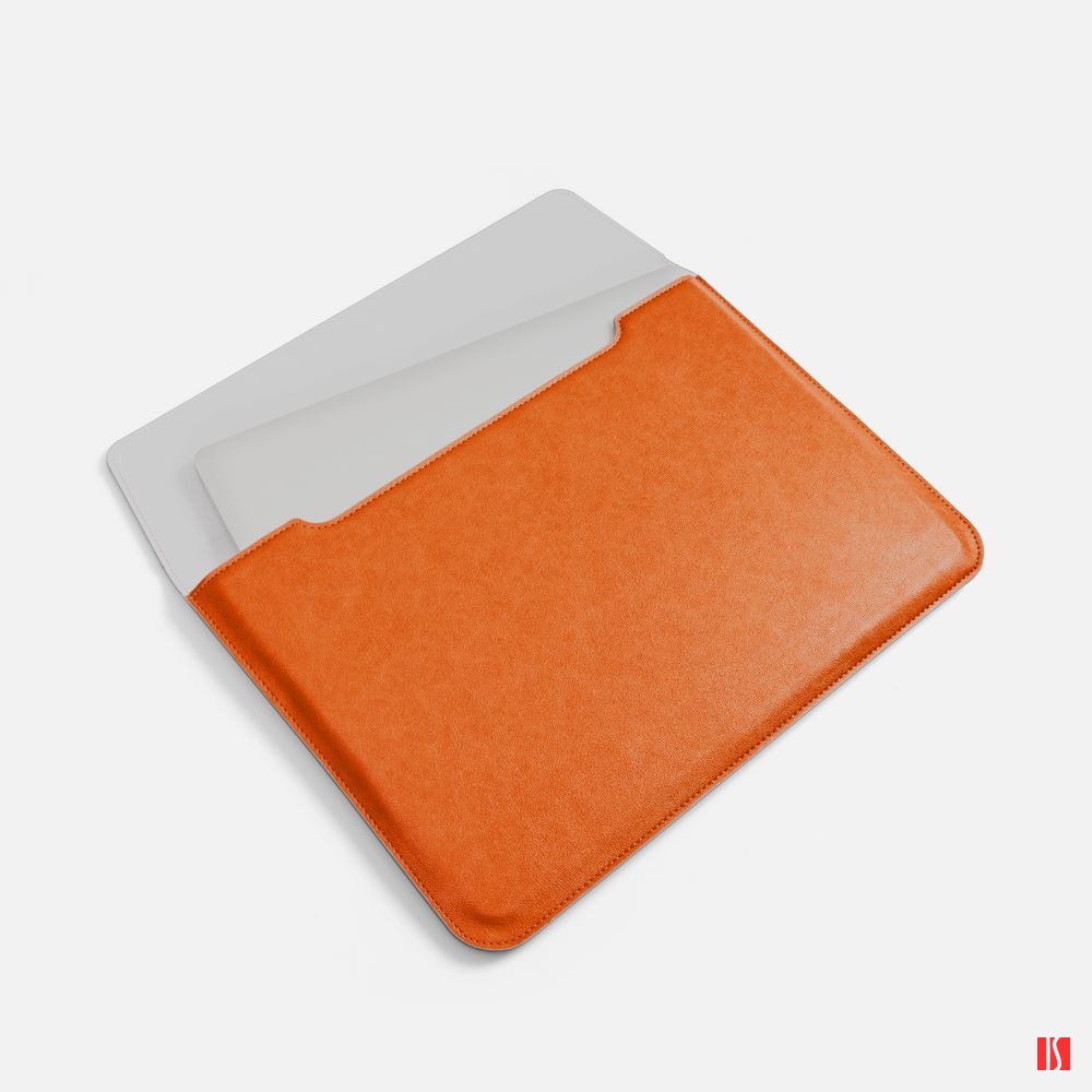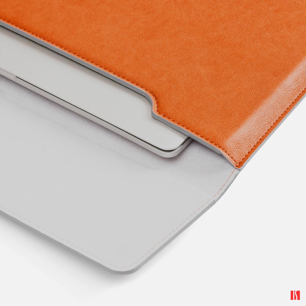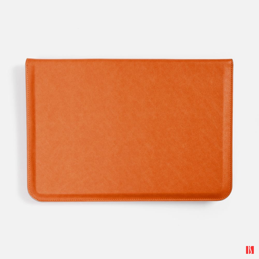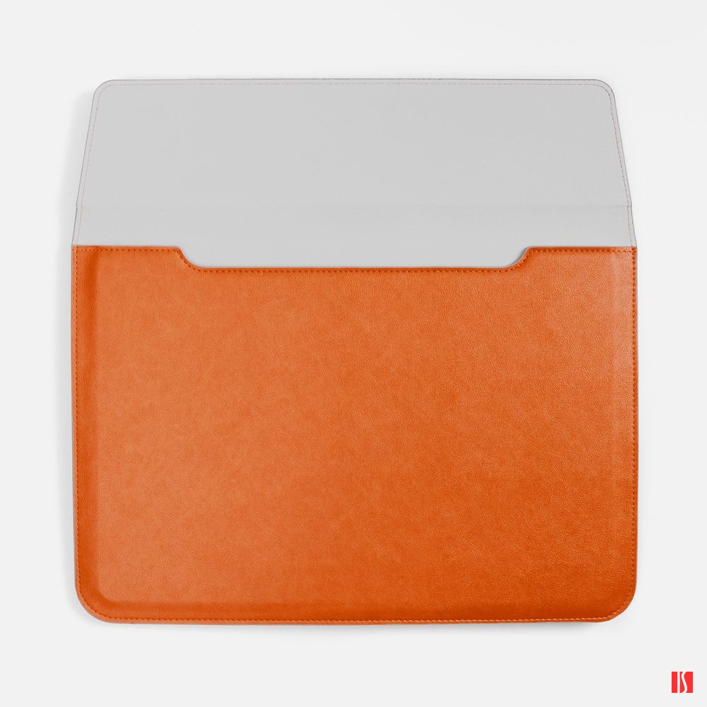 Чехол для ноутбука с диагональю до 15,6 выполнен из материала Petrus, оранжевого цвета, дополнен окрашенным срезом края серого цвета.