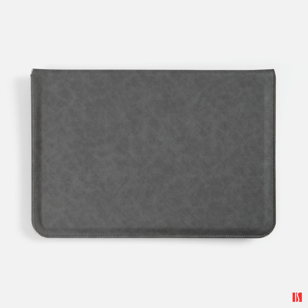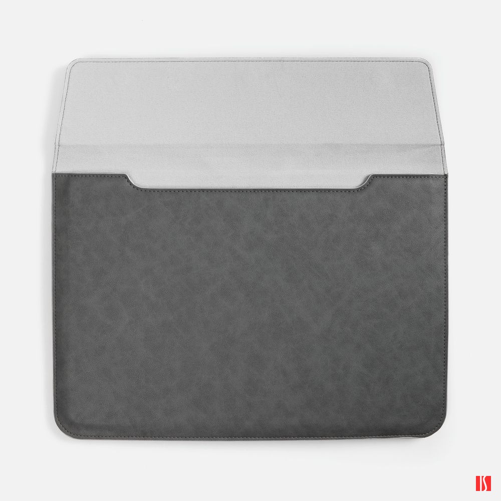 Чехол для ноутбука с диагональю до 15,6 выполнен из материала Petrus, серого цвета, дополнен окрашенным срезом края серого цвета.