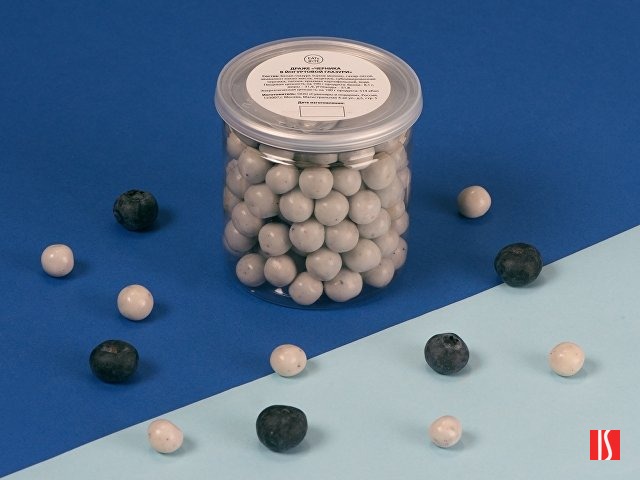 Состав: йогуртовая глазурь (сахар, молоко сухое обезжиренное, какао-масло, сыворотка молочная сухая, йогуртовый порошок натуральный (молоко обезжиренное питьевое пастеризованное, мальтодекстрин, молочная кислота), эмульгатор лецитин, сублимат черники. Заказать с нанесением логотипа от компании «Синтезис».