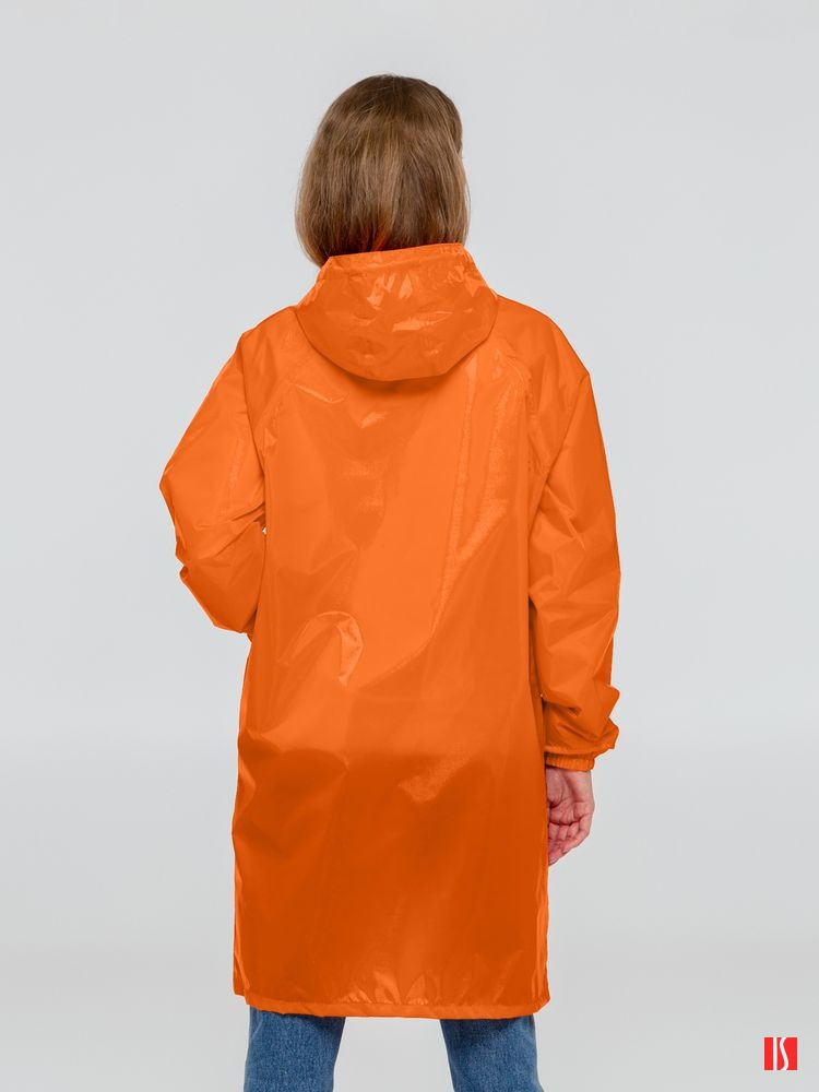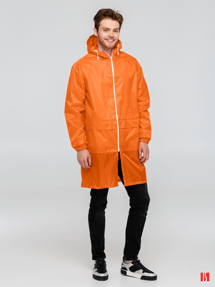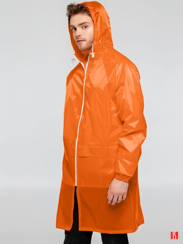 Заказать с нанесением логотипа от компании «Синтезис». Плащ–дождевик на молнии с капюшоном и рукавами реглан. Ветрозащитные манжеты на рукавах.