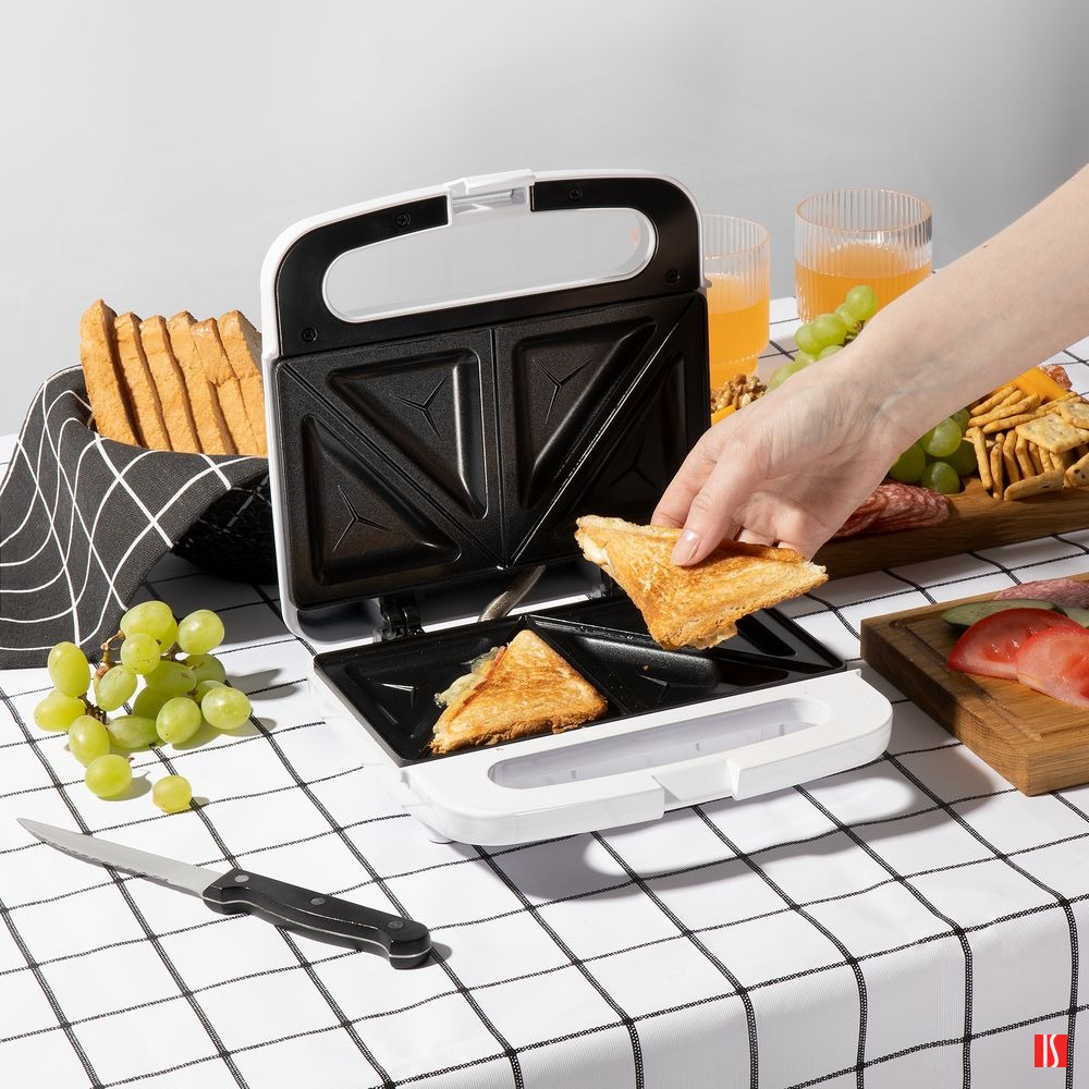 Сэндвичница быстро разогревается и поджаривает бутерброд в считаные минуты. Равномерно прогревающиеся панели с антипригарным покрытием позволяют быстро и качественно приготовить вкусную закуску с разными начинками, а затем легко очистить прибор.