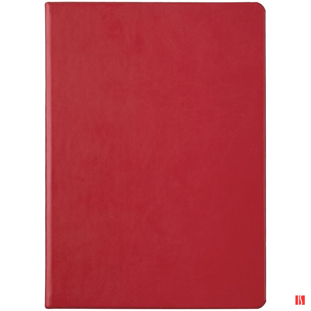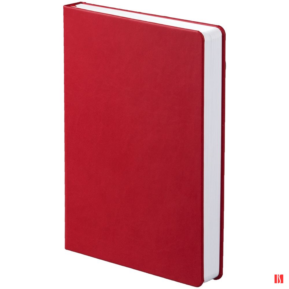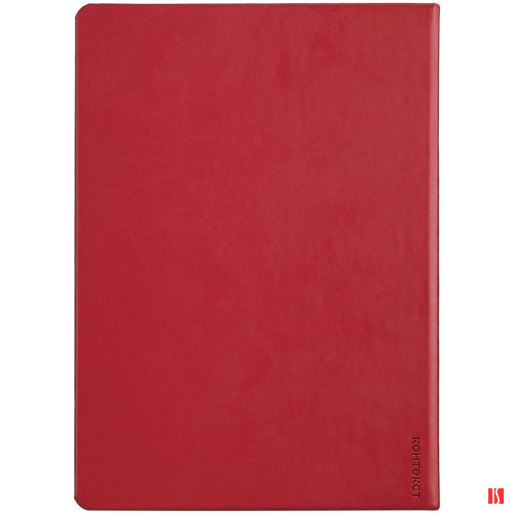 Ежедневник с твердой обложкой, выполнен из материала Latte, красный РР, дополнен ляссе в цвет обложки.