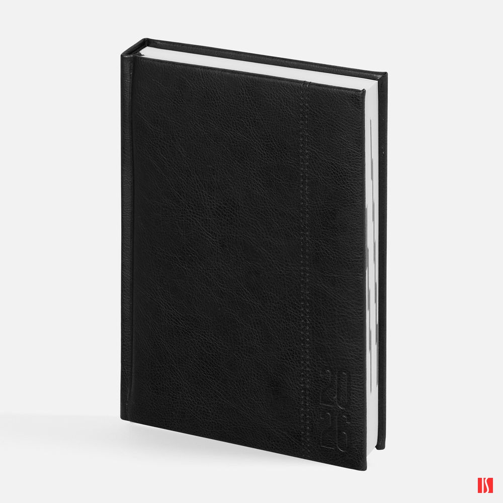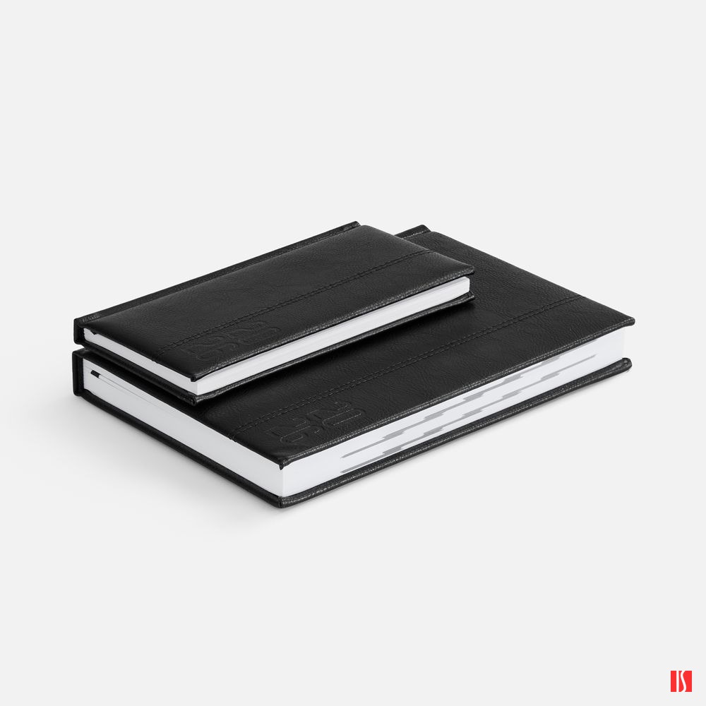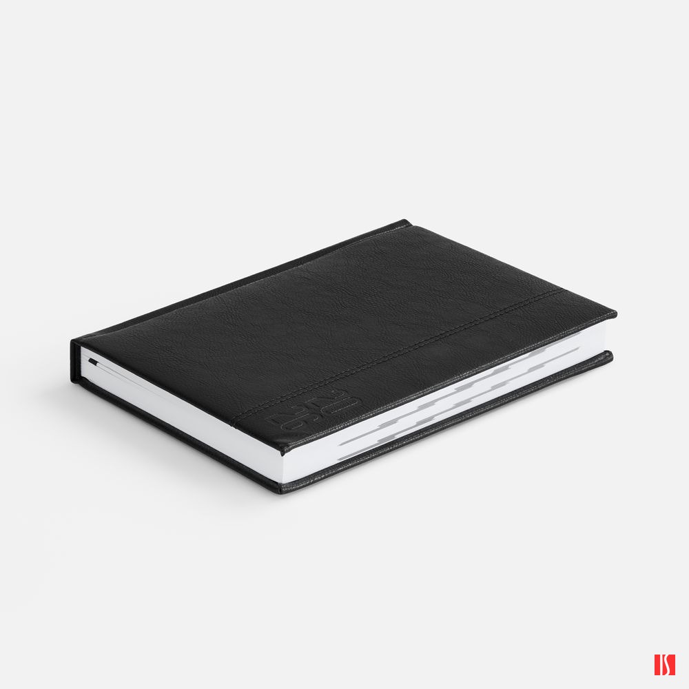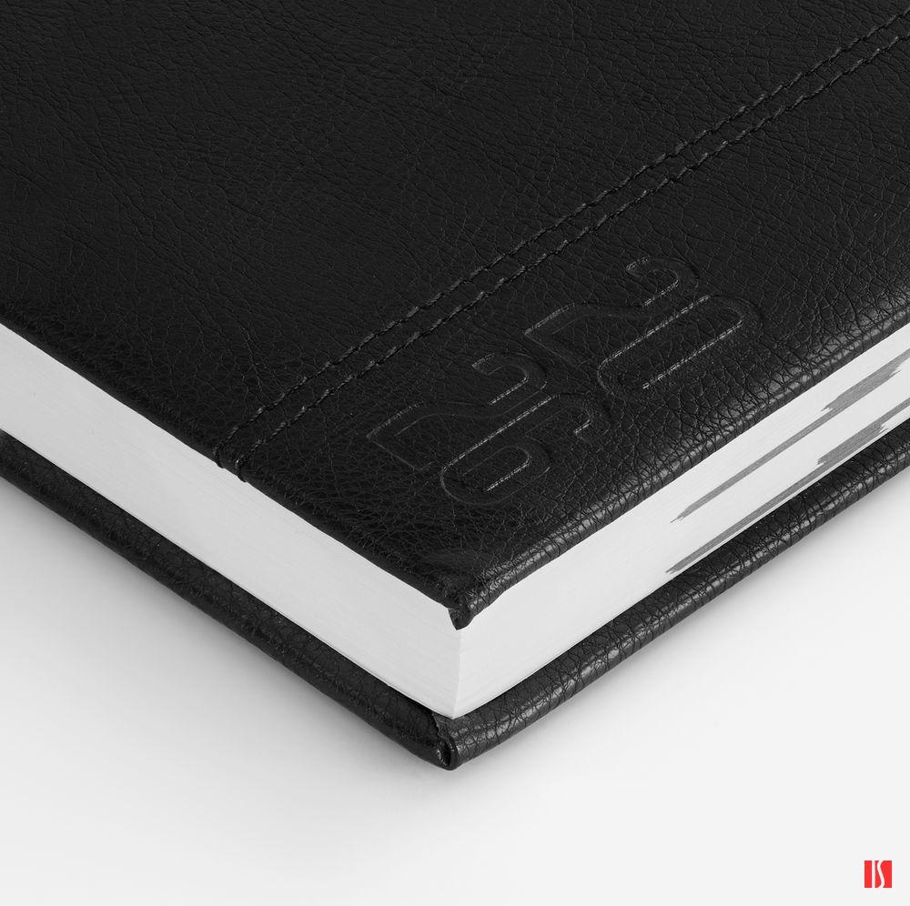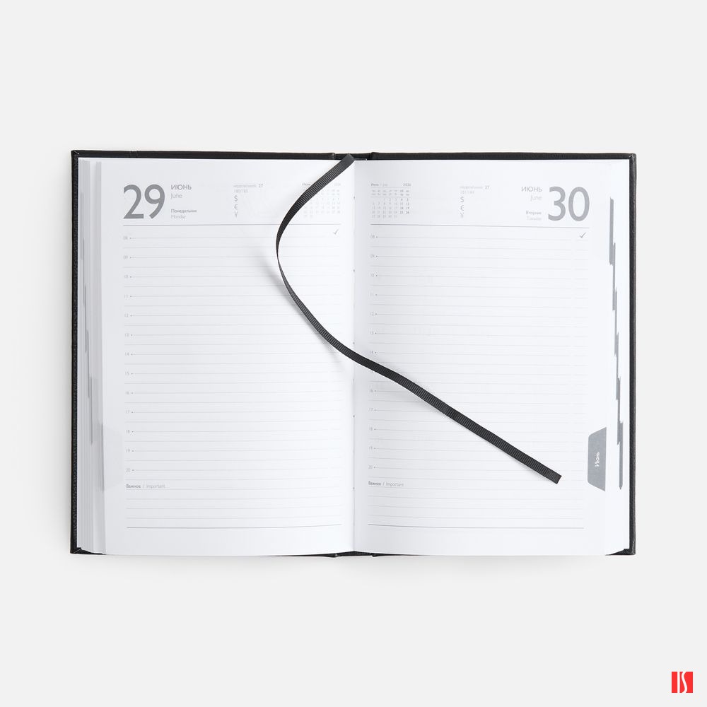 Ежедневник с твердой обложкой с поролоном из искусственной кожи, дополнен декоративной строчкой, капталом и ляссе в цвет ежедневника.