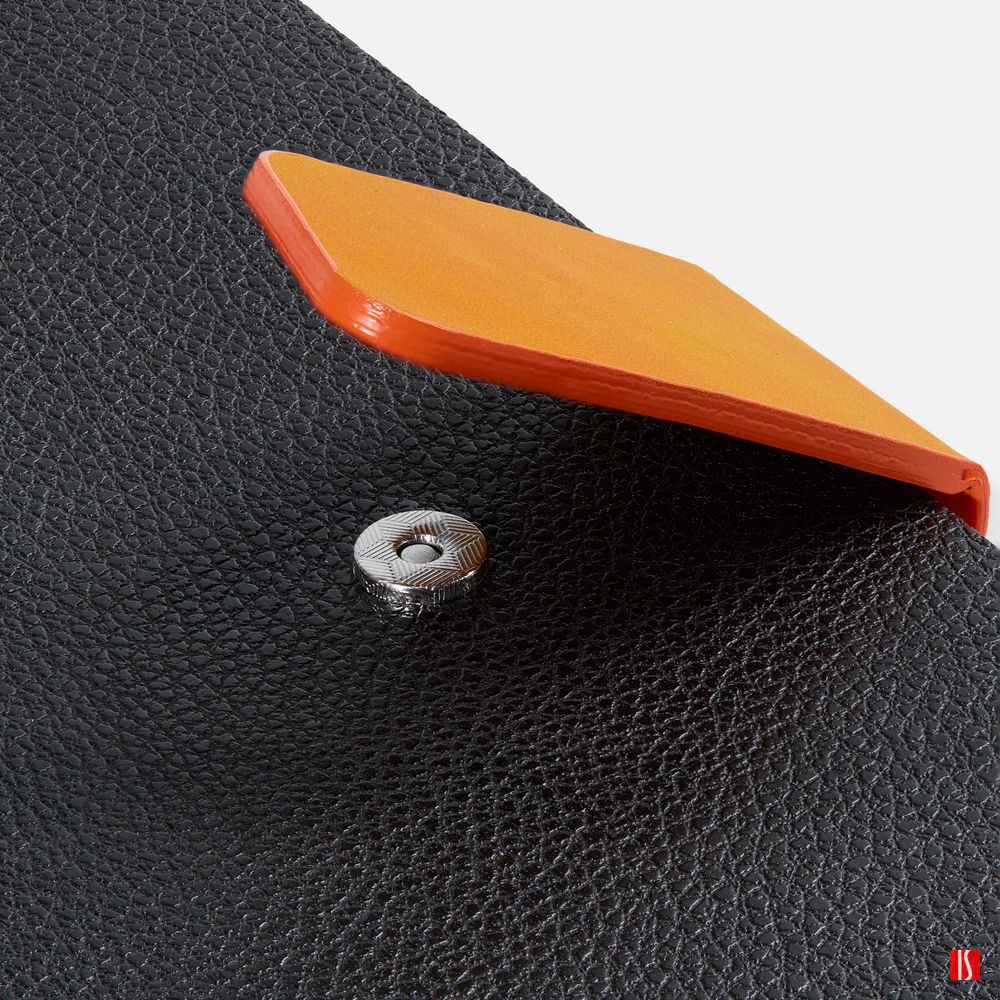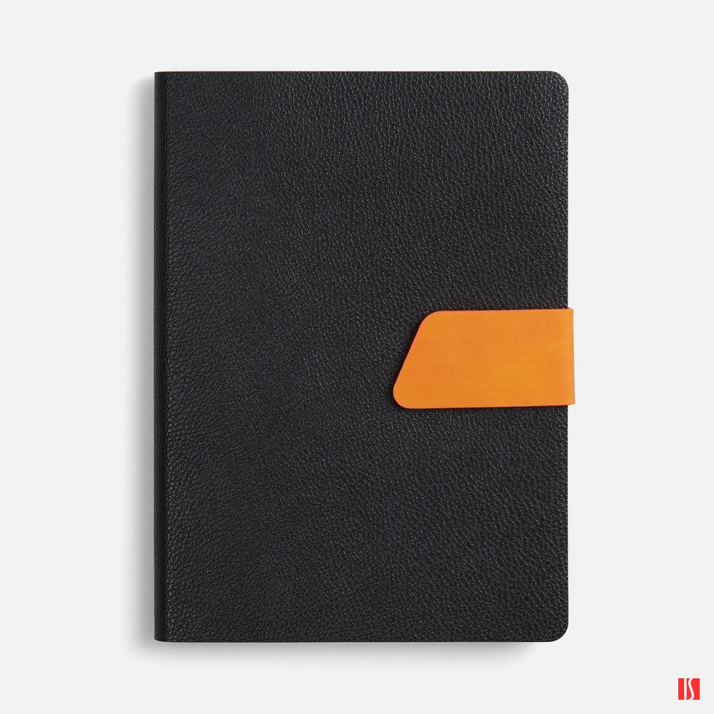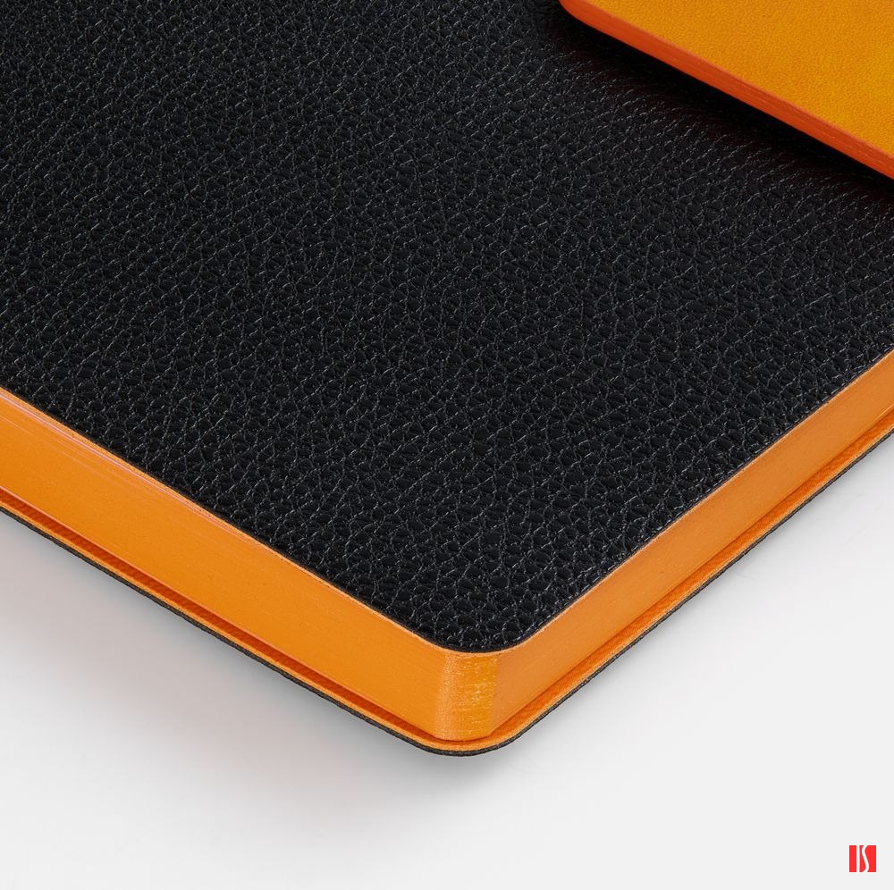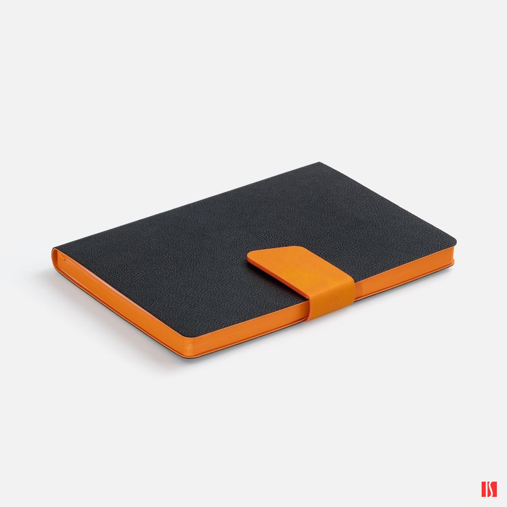 Ежедневник с гибкой обложкой, выполнен из материала La Fite, черный АА и Nubuck Touch, оранжевый, дополнен оранжевым ляссе и хлястиком на кнопке.