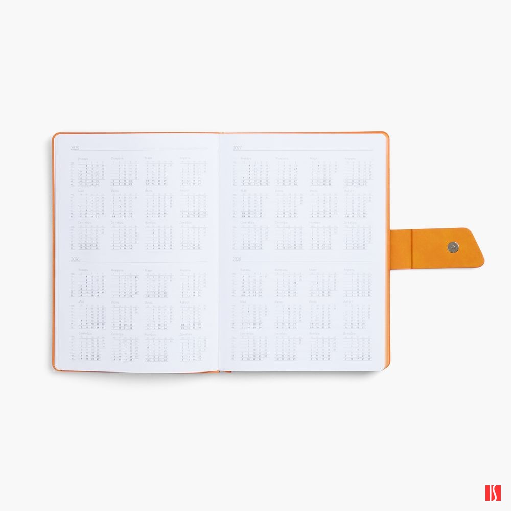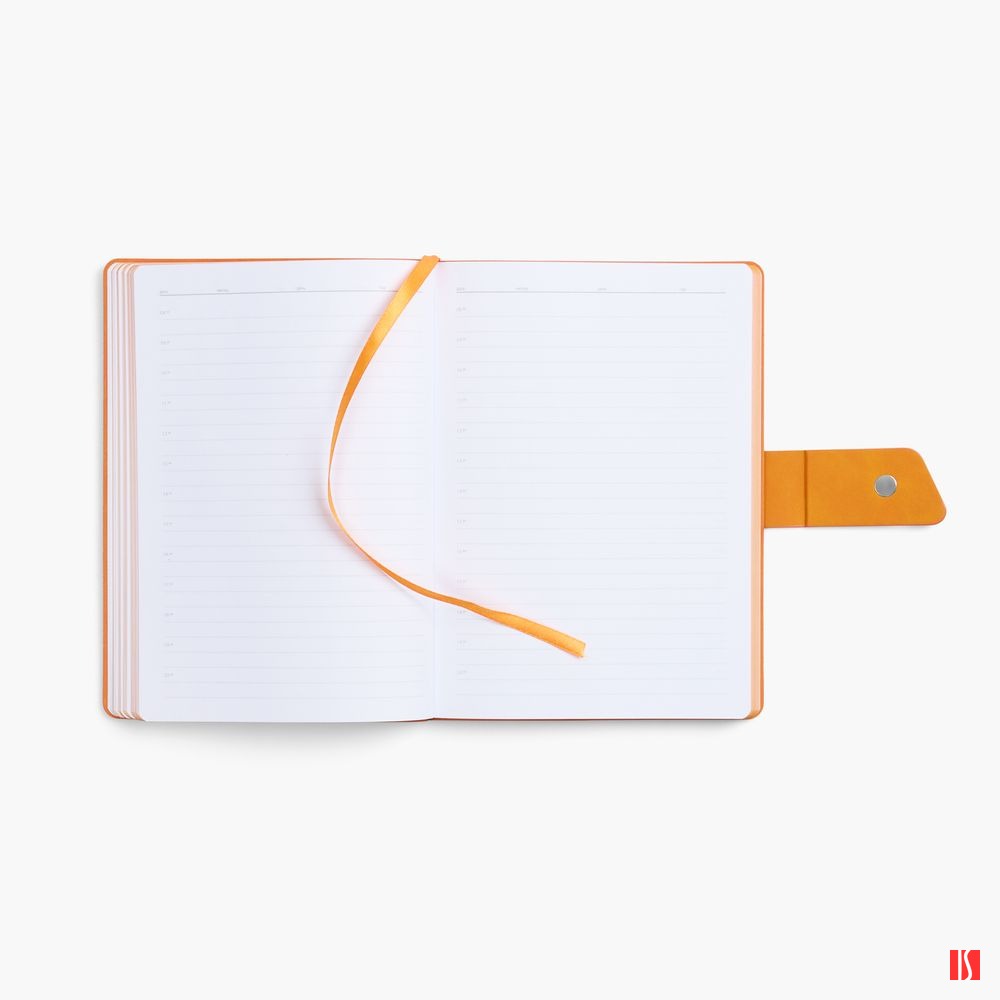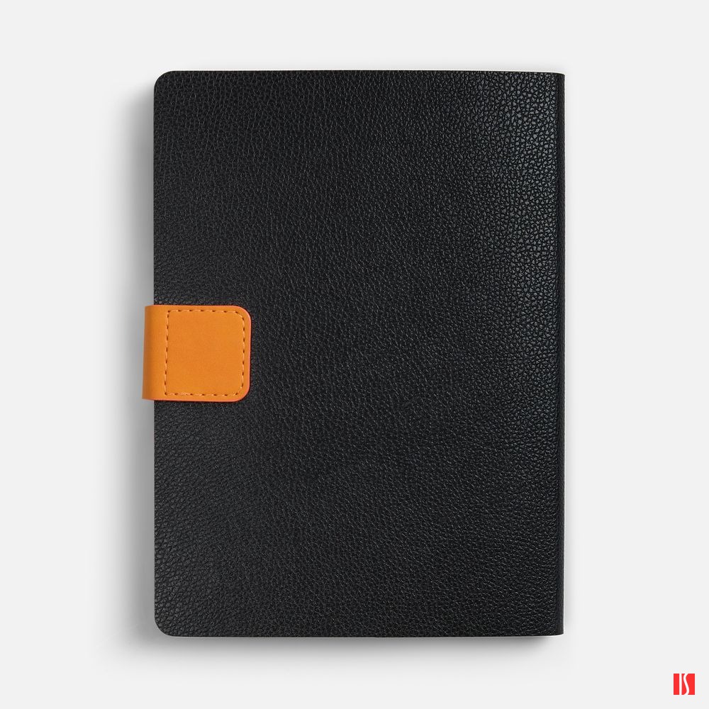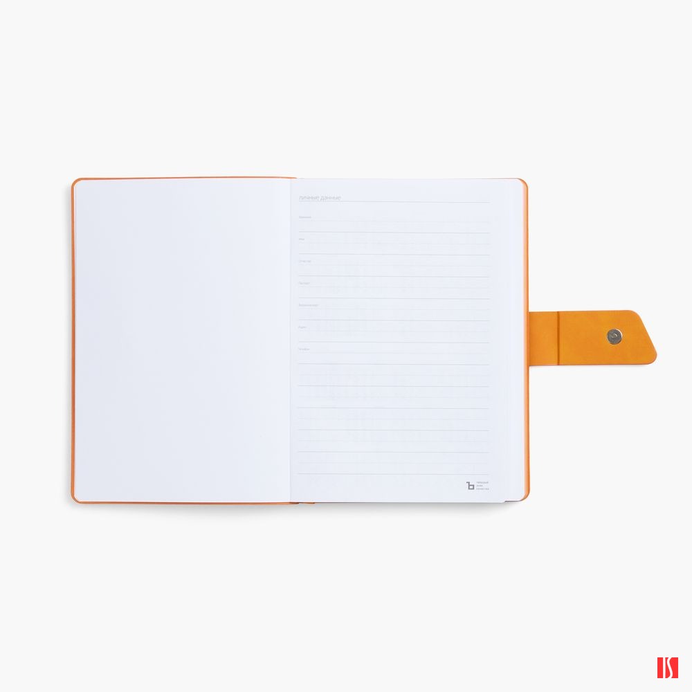Ежедневник с гибкой обложкой, выполнен из материала La Fite, черный АА и Nubuck Touch, оранжевый, дополнен оранжевым ляссе и хлястиком на кнопке.