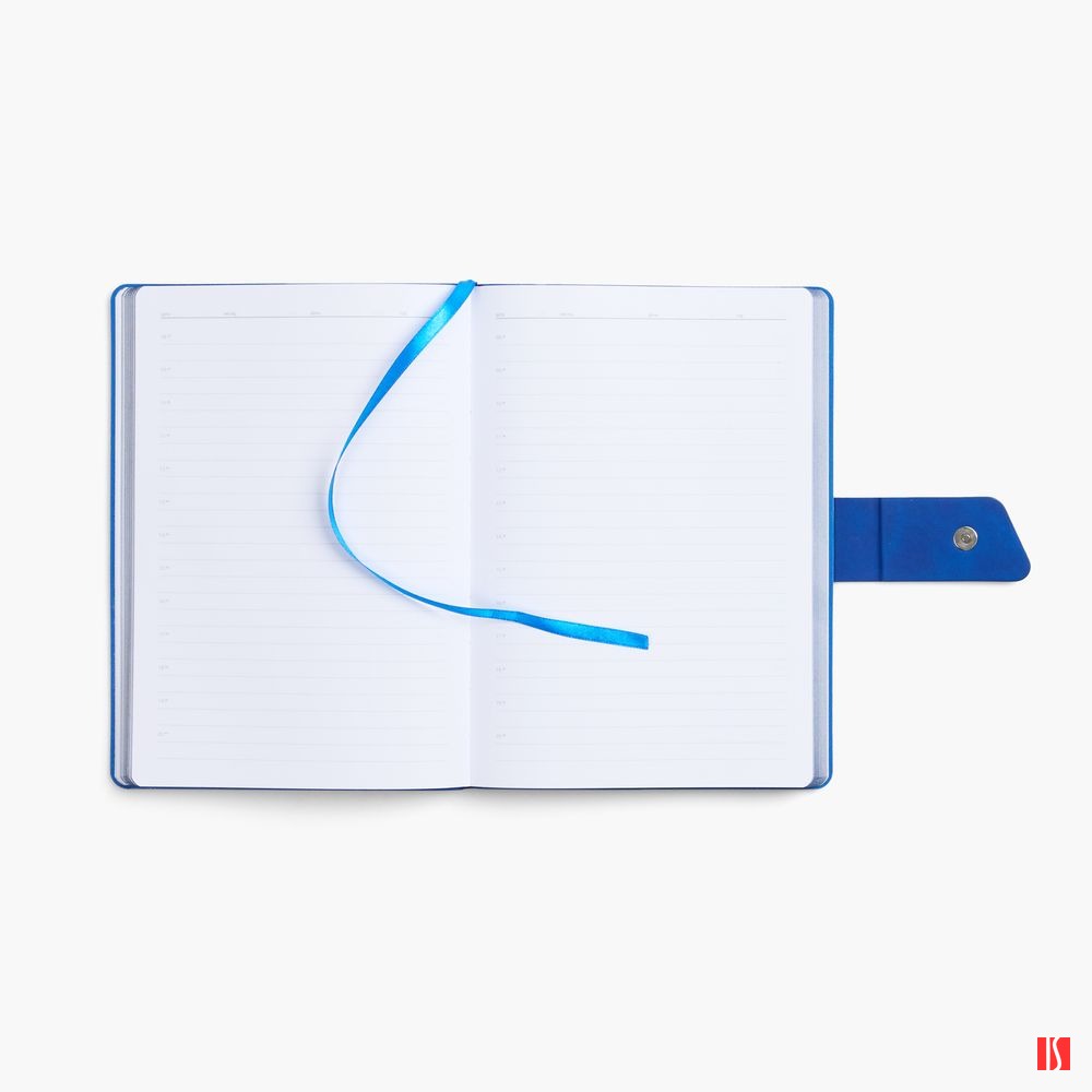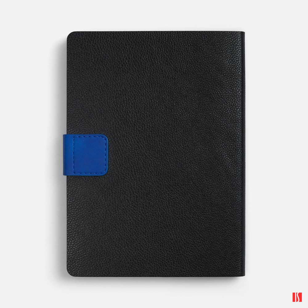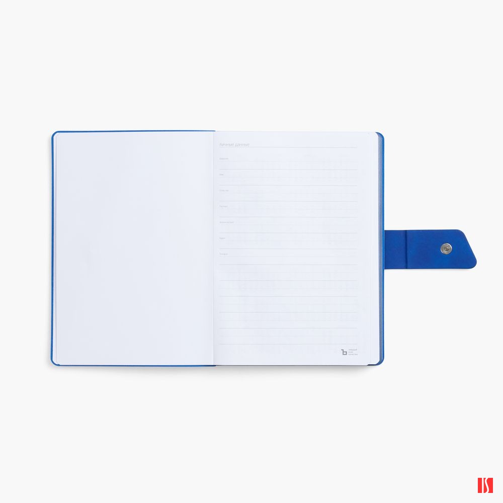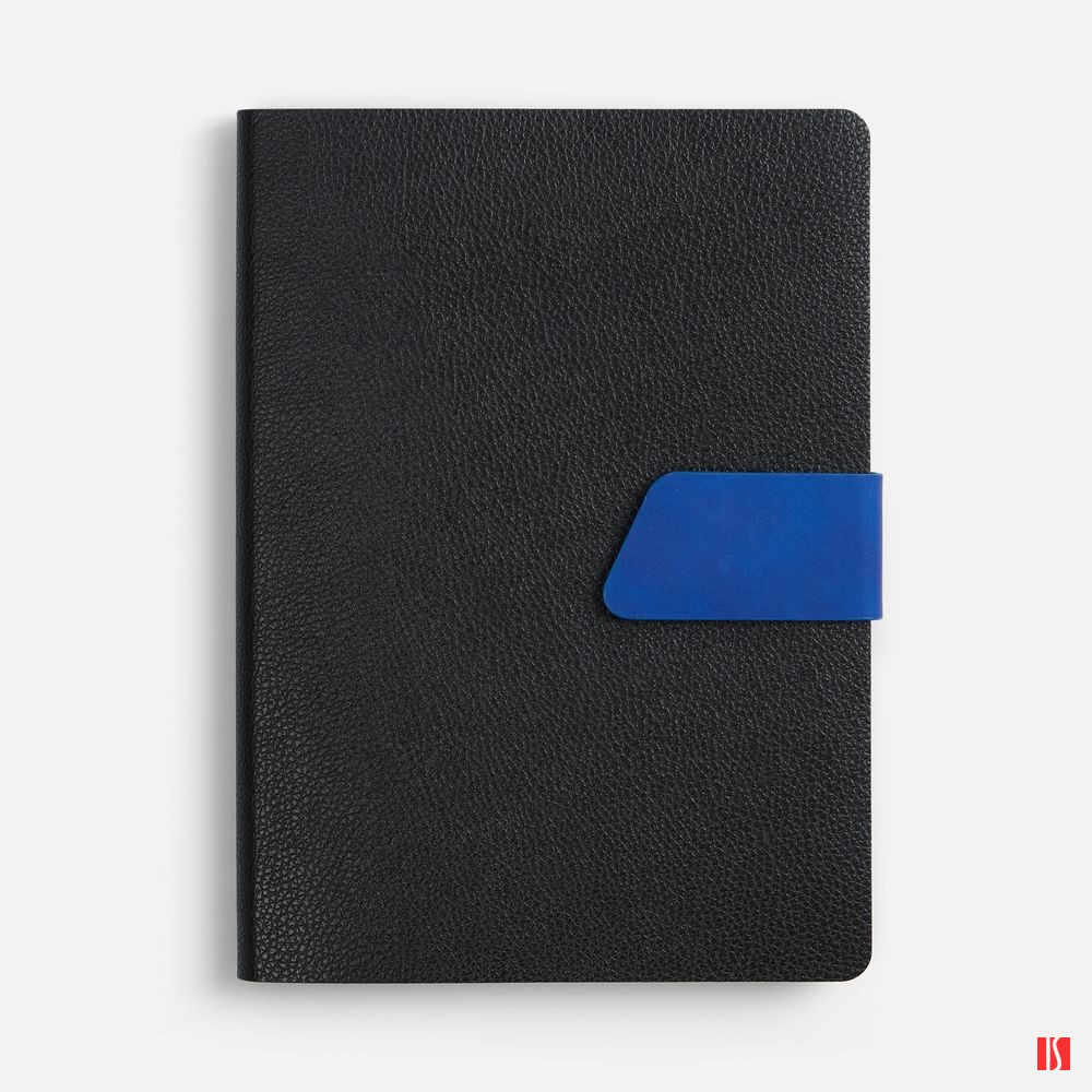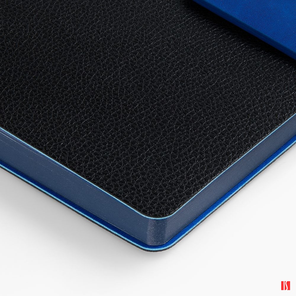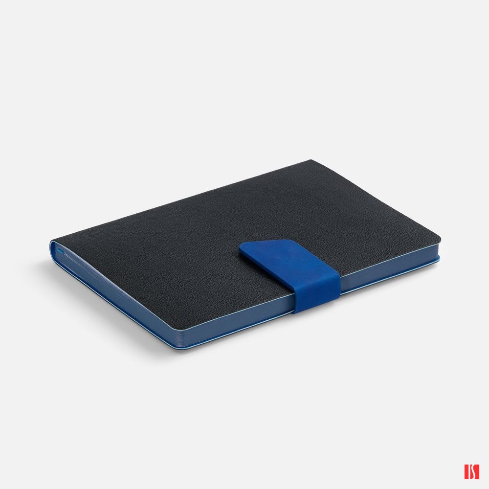Ежедневник с гибкой обложкой, выполнен из материала La Fite, черный АА и Nubuck Touch, синий, дополнен синим ляссе и хлястиком на кнопке.