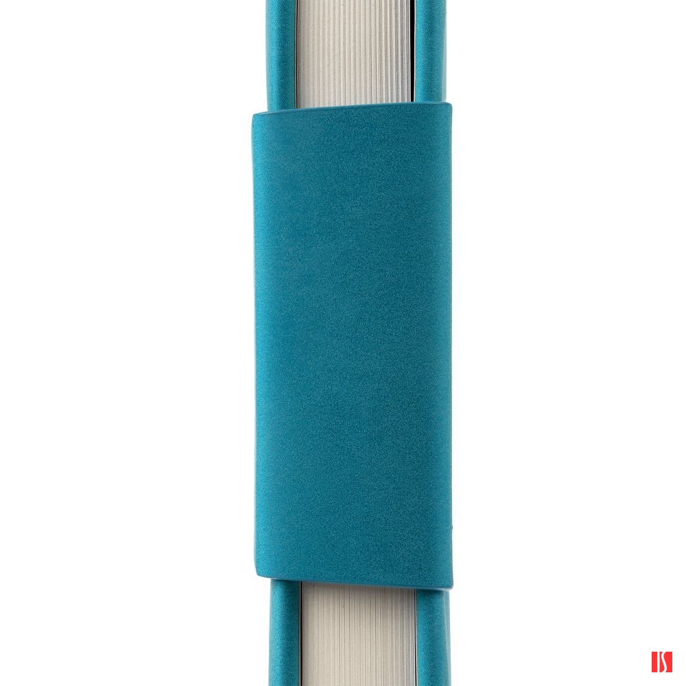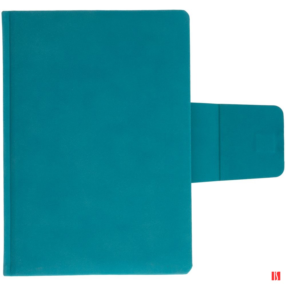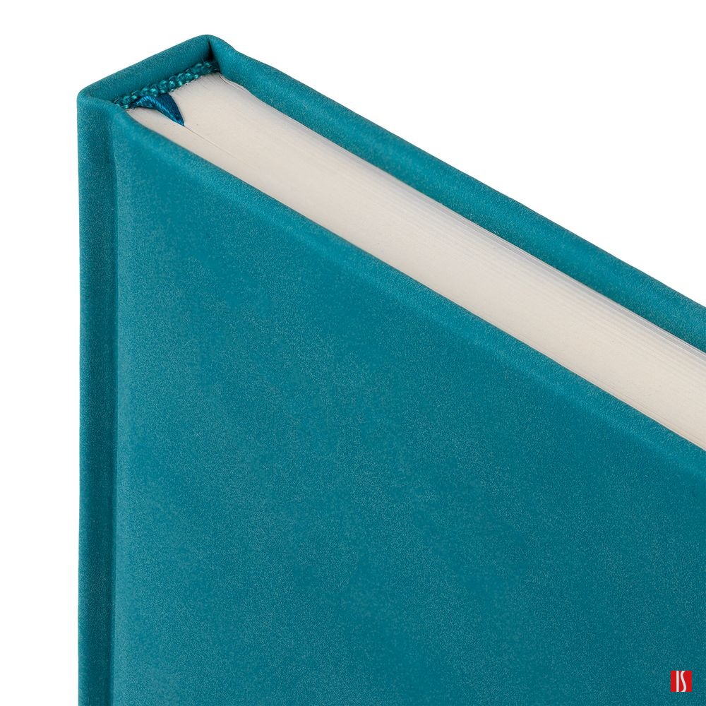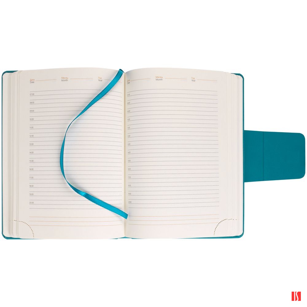 Ежедневник с твердой обложкой c поролоном, выполнен из материала Nubuck, морской волны, дополнен капталом и ляссе бирюзового цвета. Застежка — хлястик на магните.