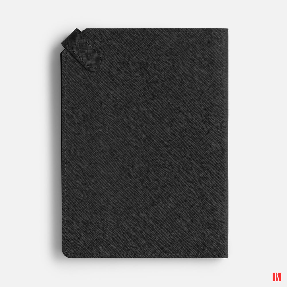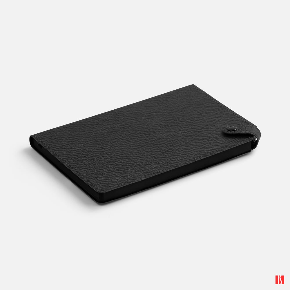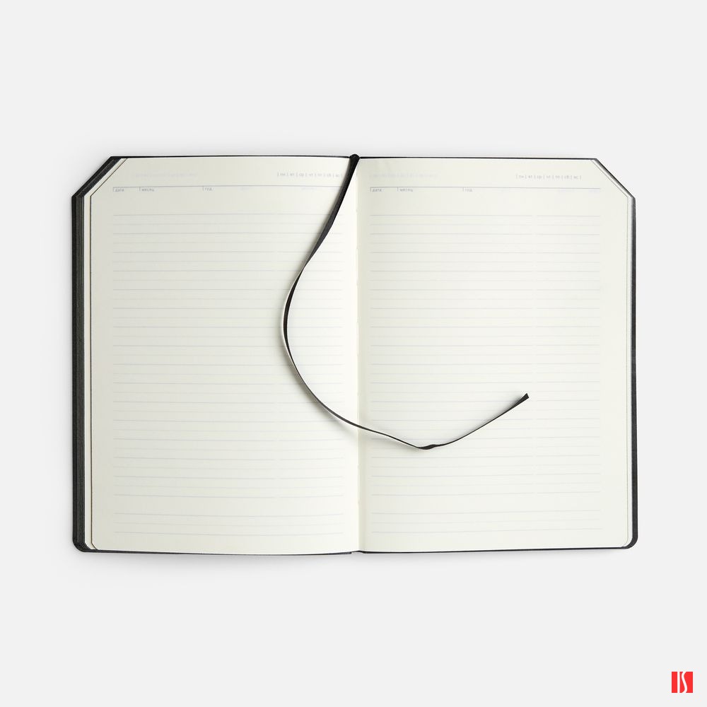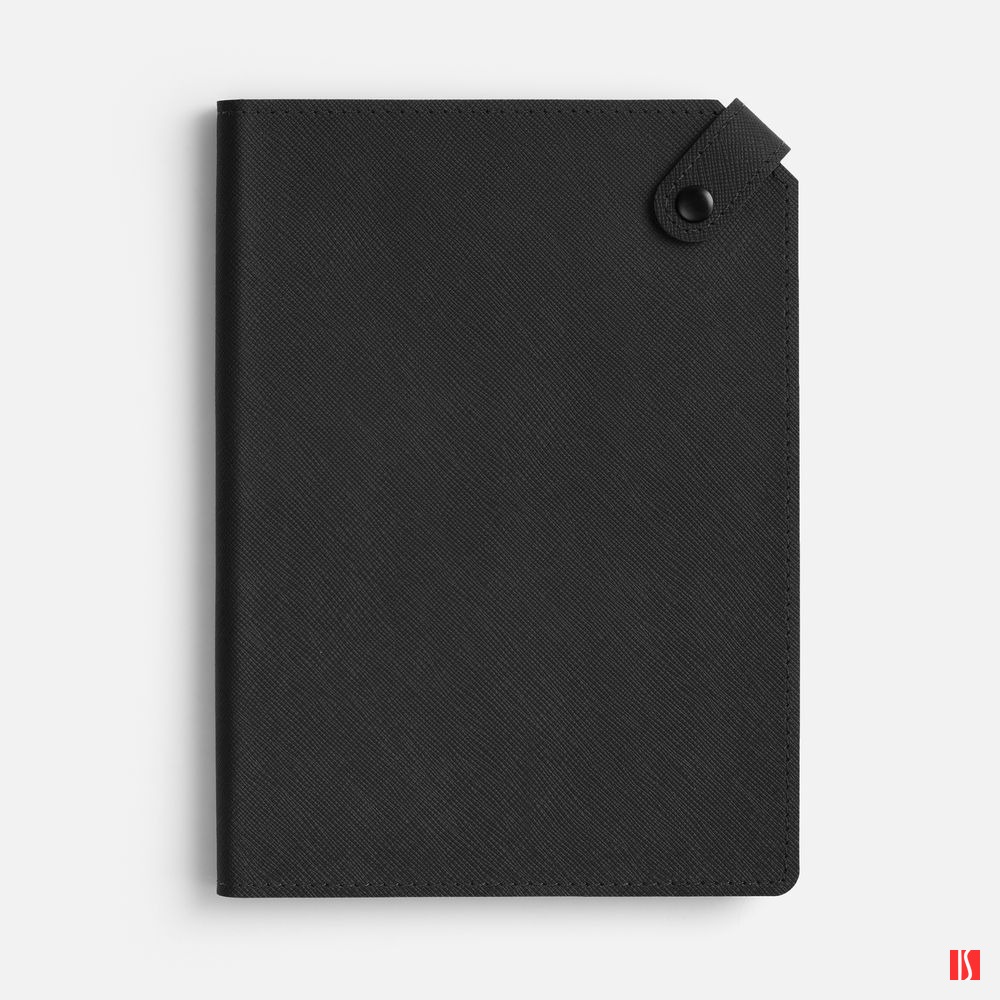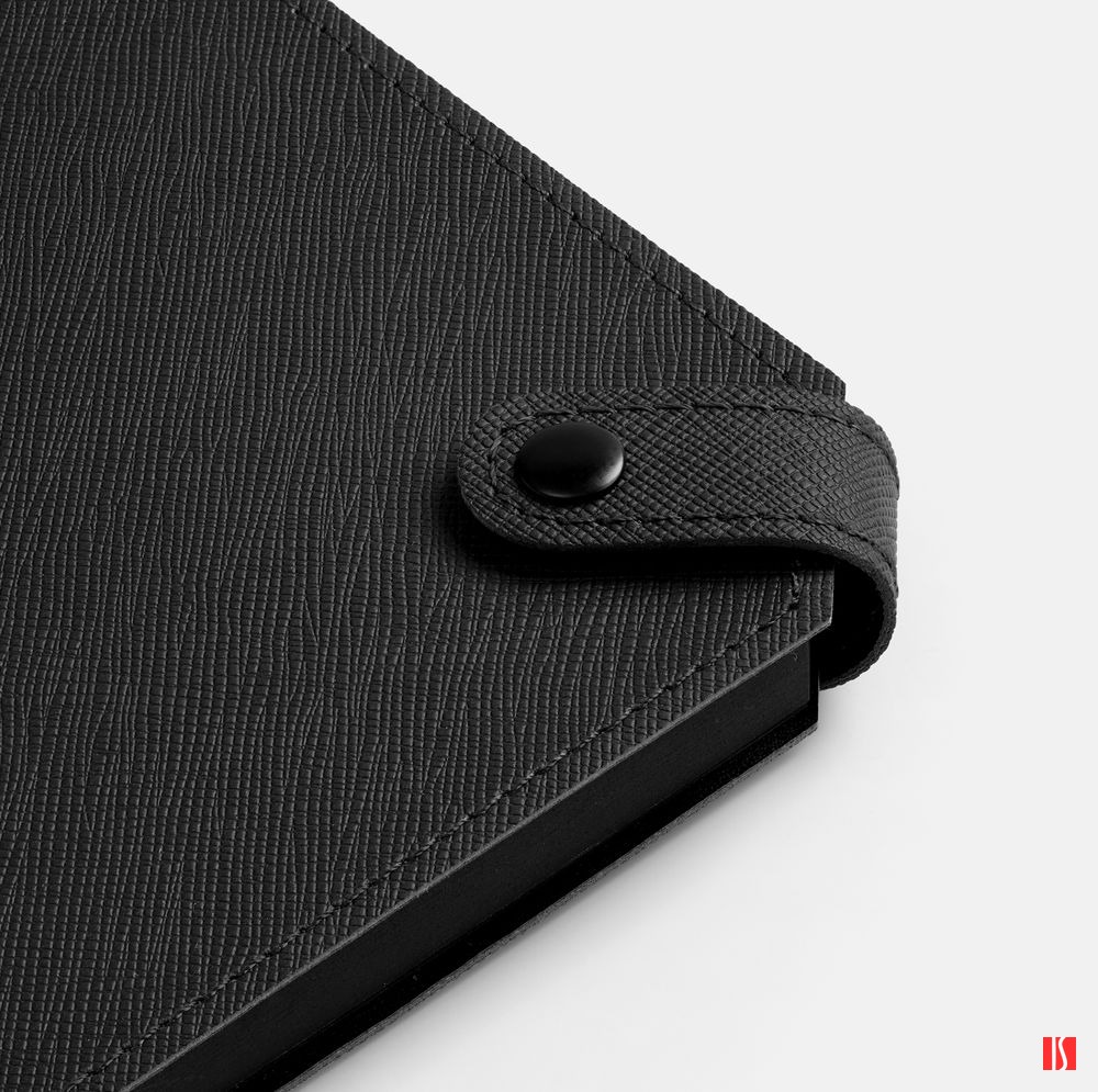 Ежедневник с гибкой обложкой, выполнен из материала Espresso, дополнен ляссе черного цвета и хлястиком на кнопке.