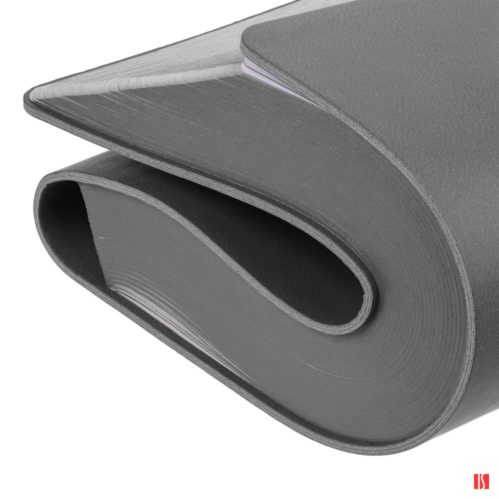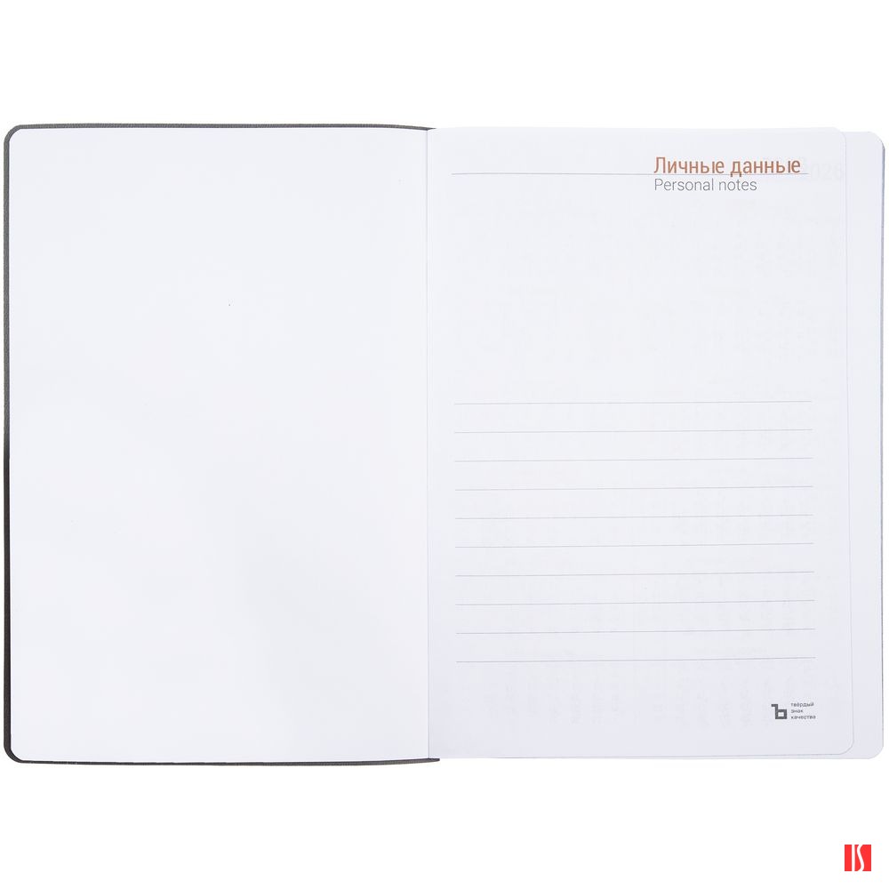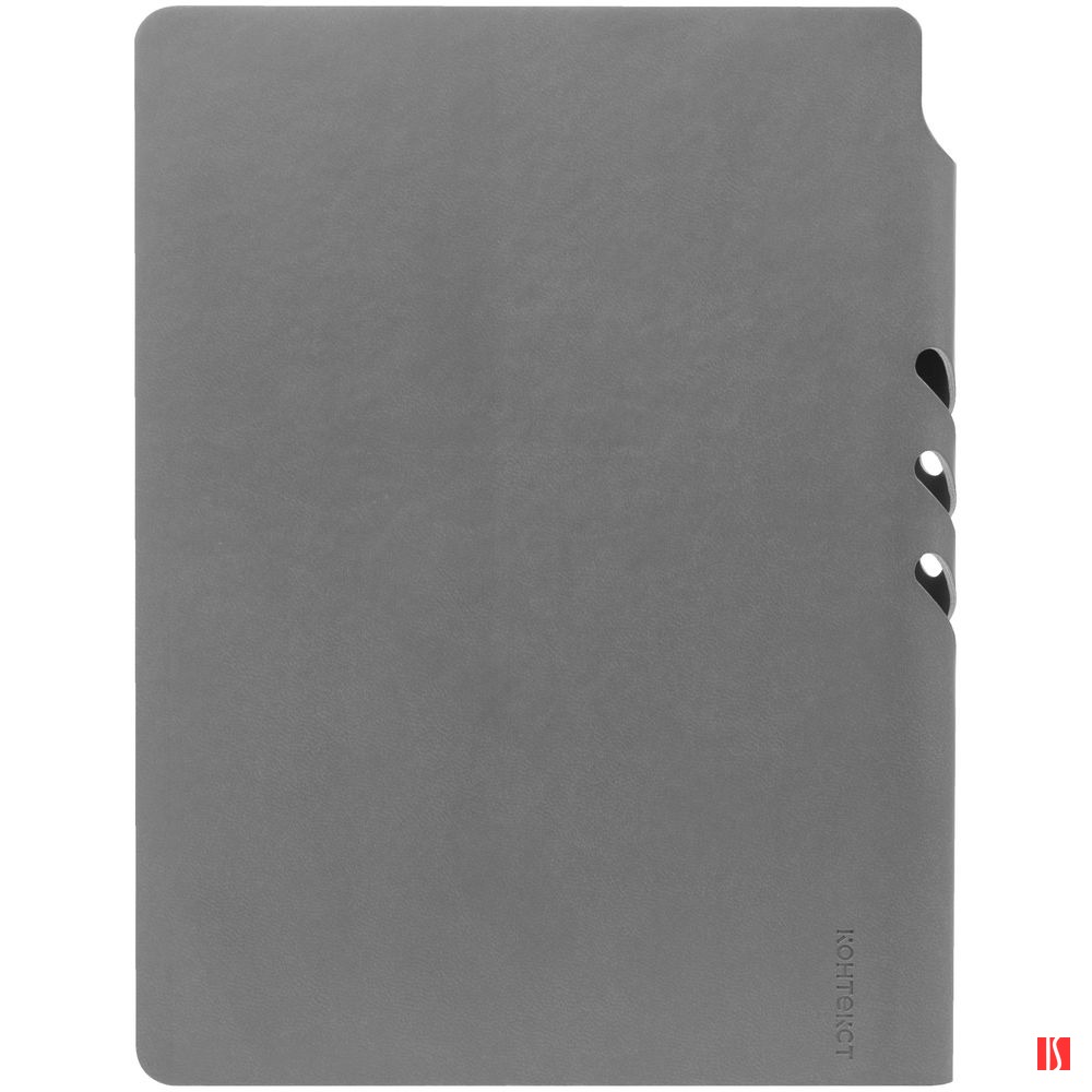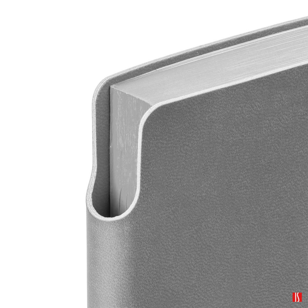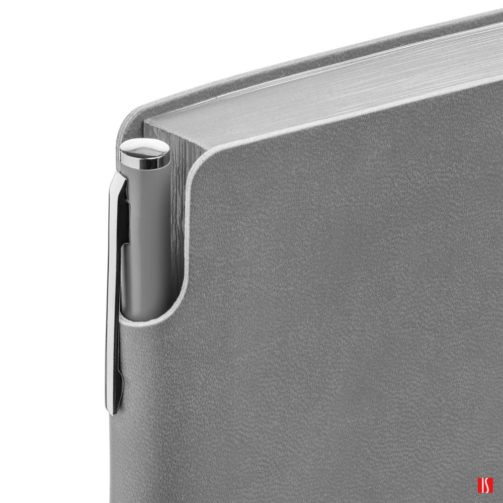 Гибкая обложка ежедневника выполнена из материала Latte, серый СС. Внутри корешка — специальное место для крепления ручки размером до 15х0,9 см.