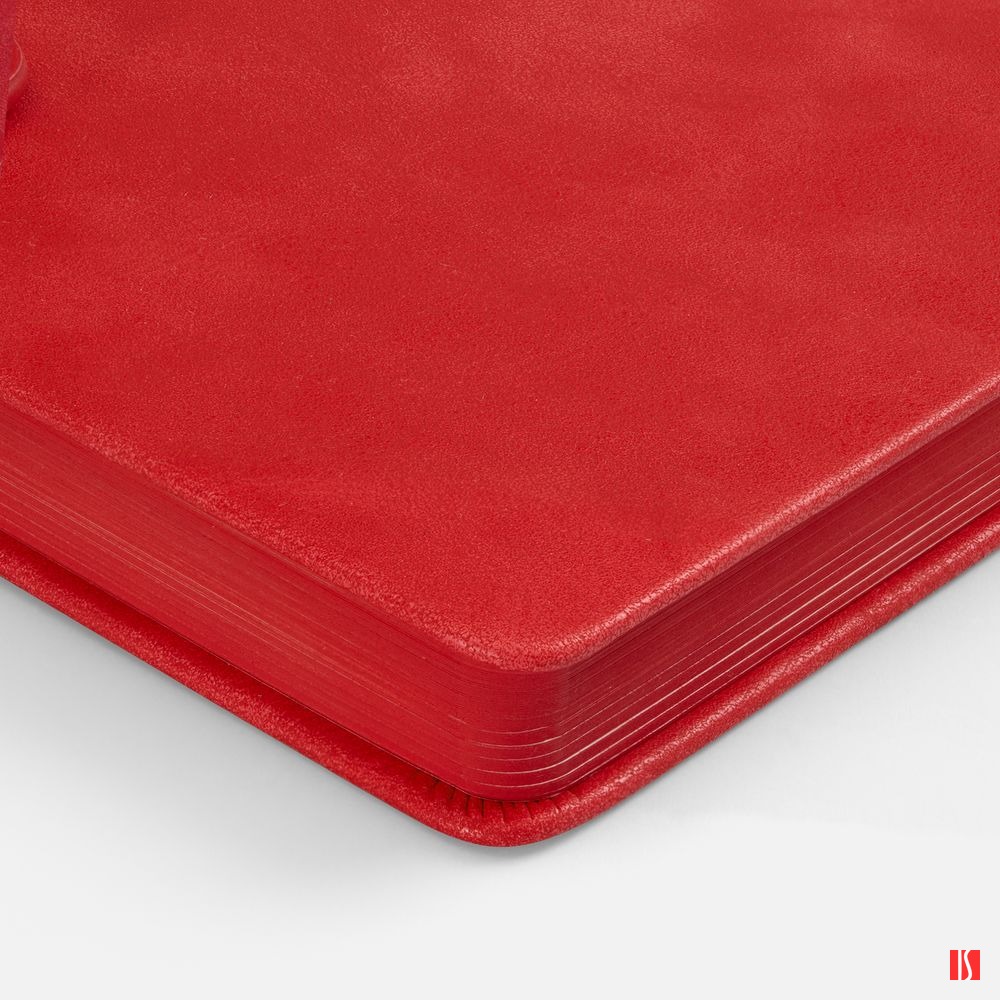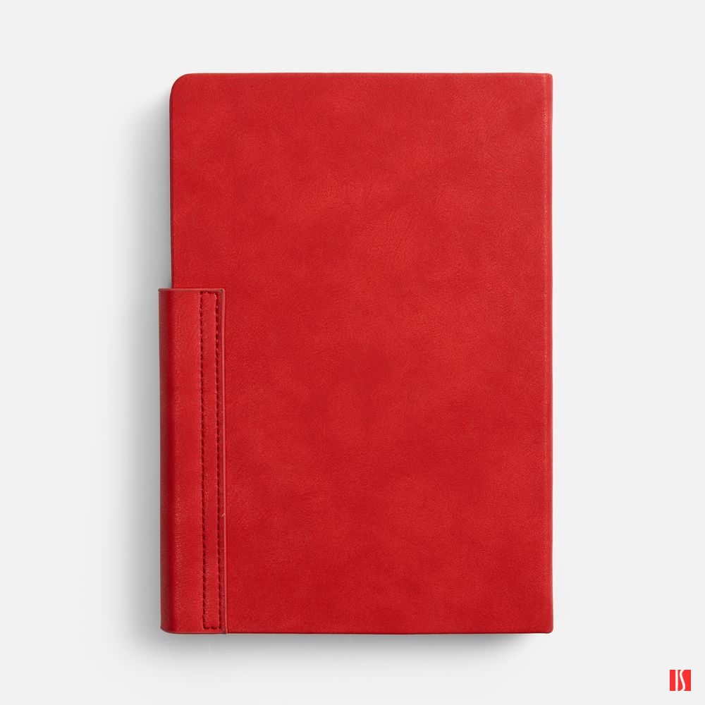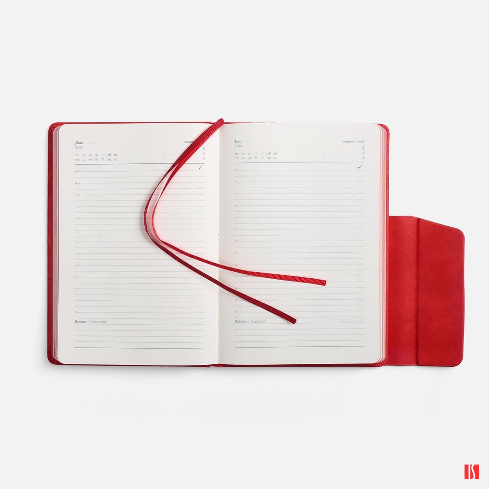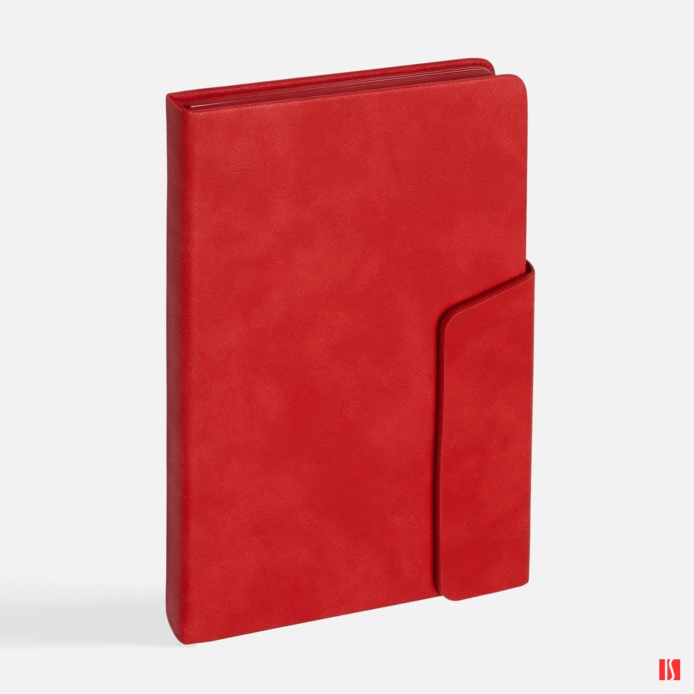 Ежедневник с твердой обложкой и фигурным магнитным клапаном, дополнен капталом и двойным ляссе.