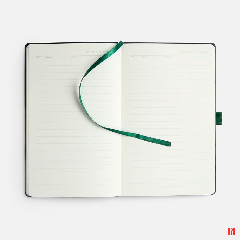 Ежедневник с гибкой обложкой, выполнен из материала Espresso, дополнен цветными ляссе и петлей-резинкой для ручки.