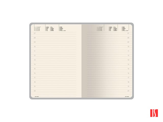 Классическое воплощение минимализма: формат А5, гибкая обложка, скругленный угол блока и обложки, ровные, четкие линии, отсутствие декоративных элементов. Внутренний блок изготовлен из бежевой бумаги плотностью 70 г/м2 и, помимо раздела для планирования рабочего времени, включает в себя 12 страниц справочной информации.
