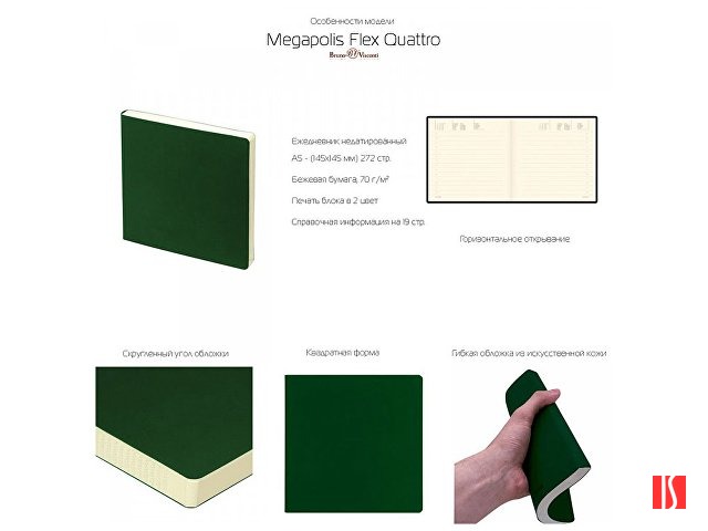 Заказать с нанесением логотипа от компании «Синтезис». Оригинальный формат ежедневника Megapolis Flex Quattro никого не оставляет равнодушным. Большинство покупателей влюбляются в него с первого взгляда. Обложка выполнена из качественного, тактильно приятного искусственного материала, гибкая и не ломкая. Великолепная бежевая бумага плотностью 70 г/м и практичная линовка с расписанным временем для планирования дел. Этот ежедневник отлично поместится даже в маленькую сумку, а у всех, кто его увидит вызовет неподдельный восторг. Справочная информация на 19 страницах и телефонная книга на 28. Удобно, практично и, конечно же, стильно!