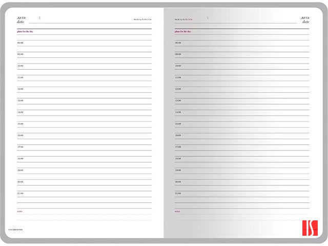 Благородство и статусность придают ежедневнику отстрочка по периметру в тон, скругленные углы, закладка-ляссе бордового цвета, серебряный обрез и металлические уголки.