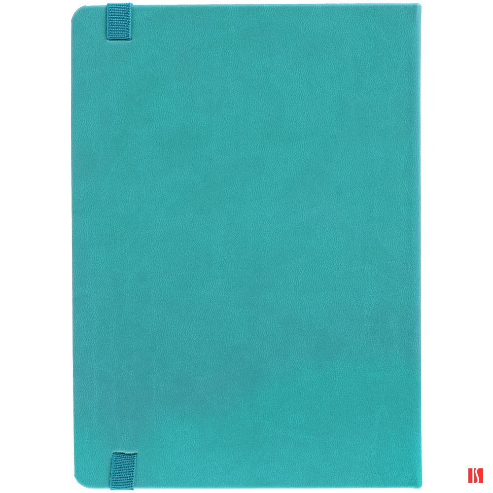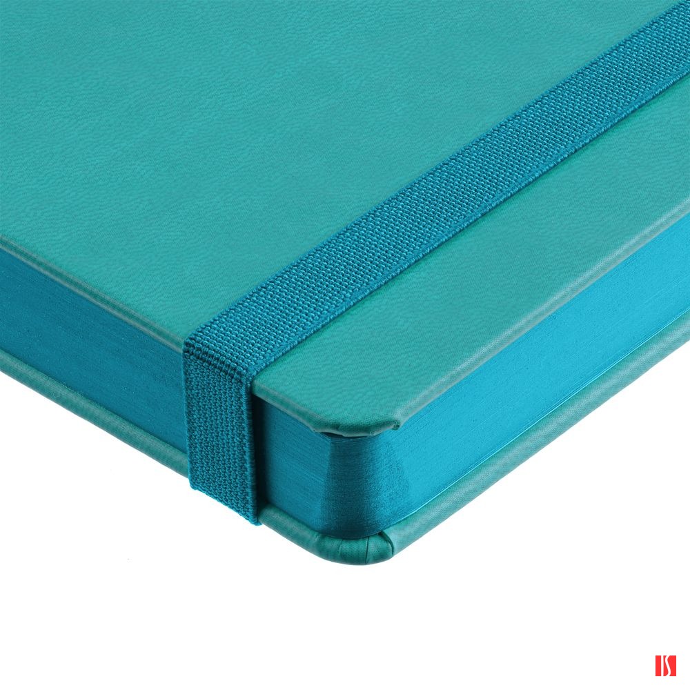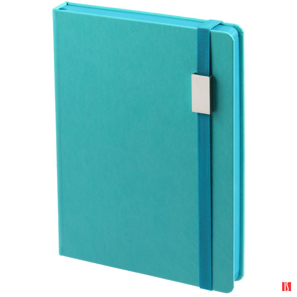 Ежедневник с твердой обложкой, выполнен из материала Latte, цвет морской волны II, обрез бирюзового цвета, дополнен ляссе бирюзового цвета и резинкой с металлическим шильдом.