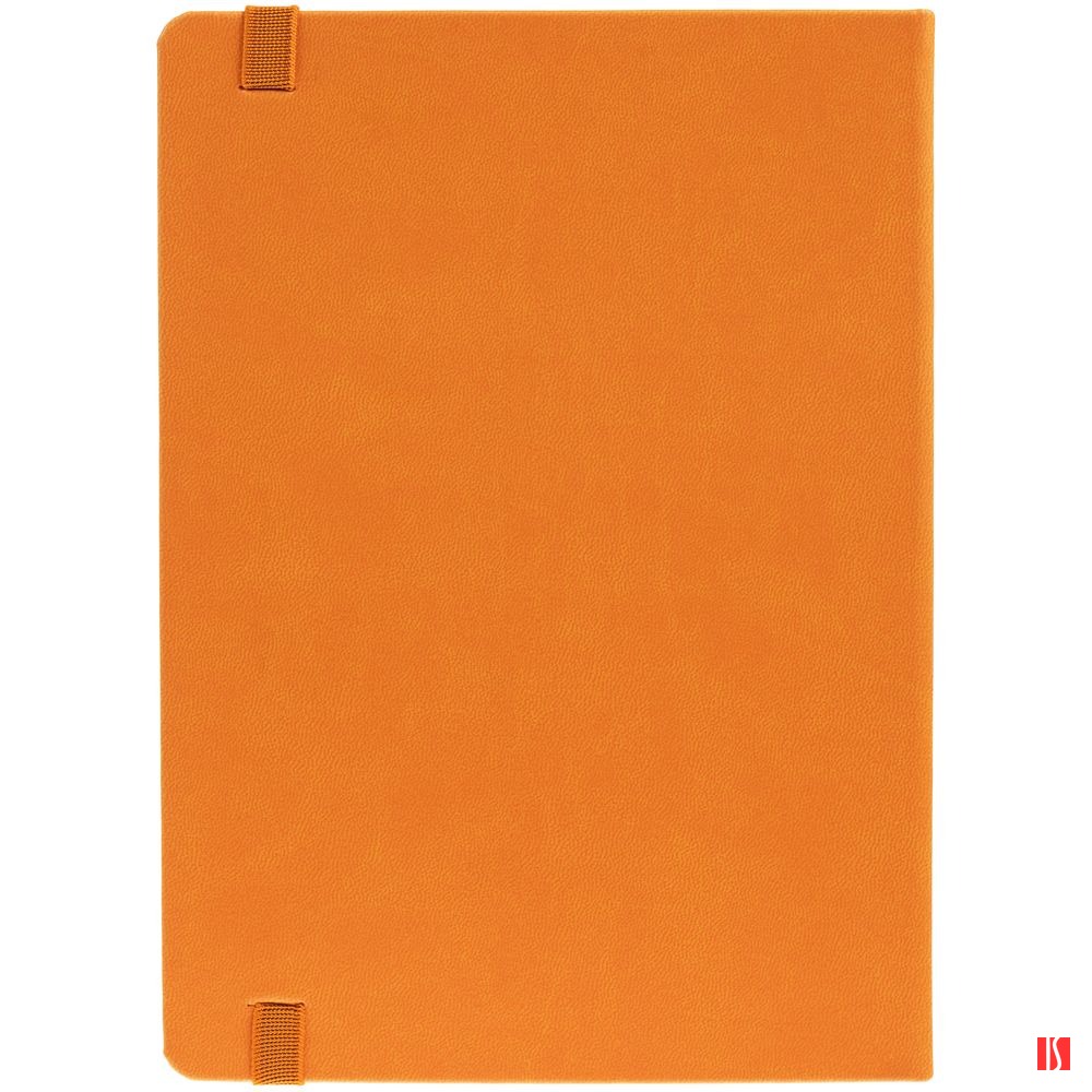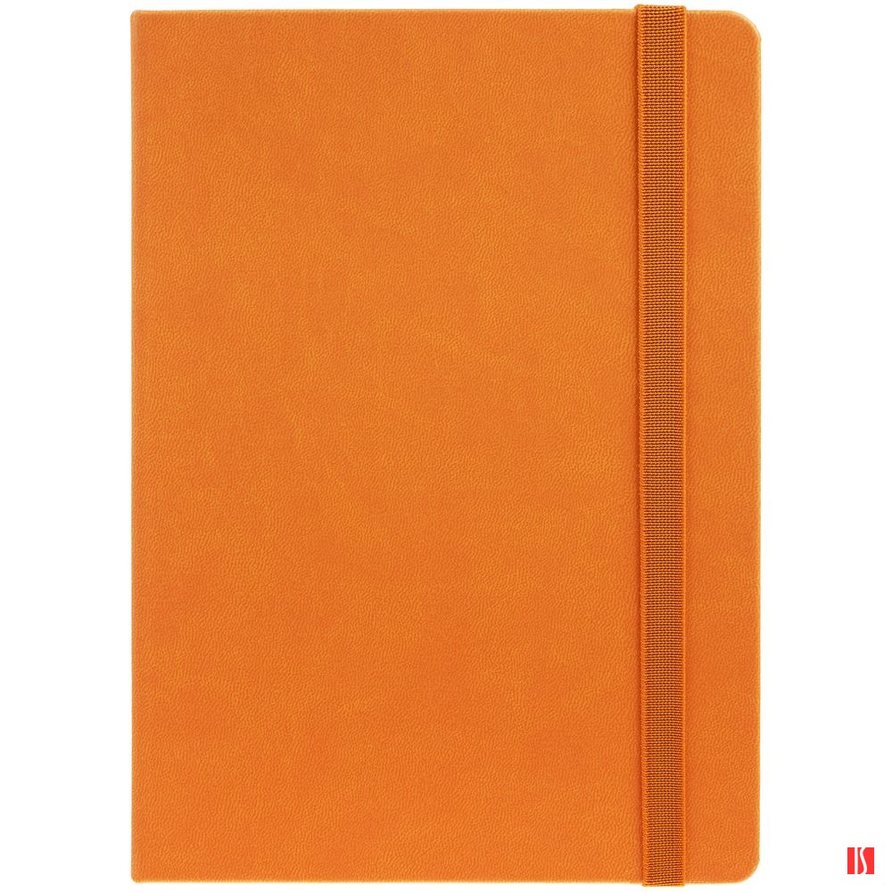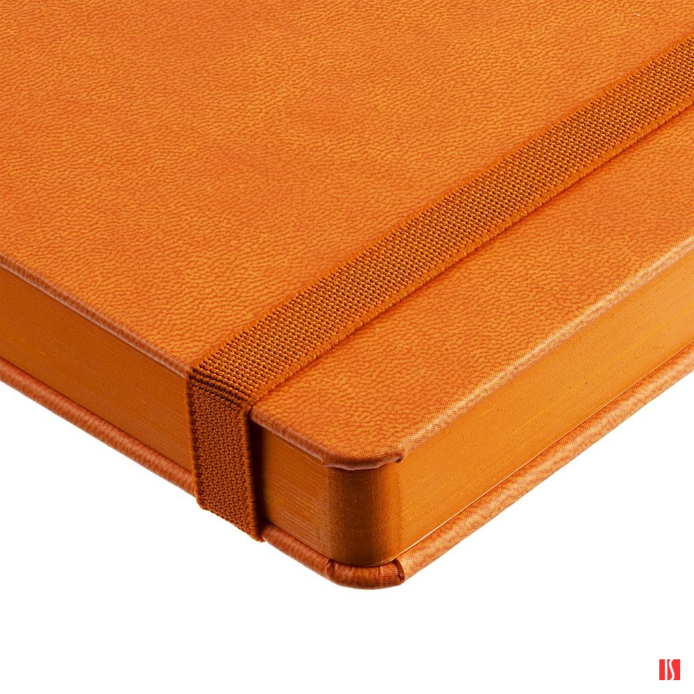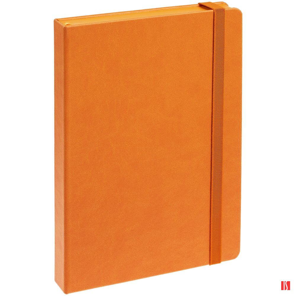 Ежедневник с твердой обложкой, выполнен из материала Latte, оранжевый ОО, обрез оранжевого цвета, дополнен резинкой и ляссе оранжевого цвета.