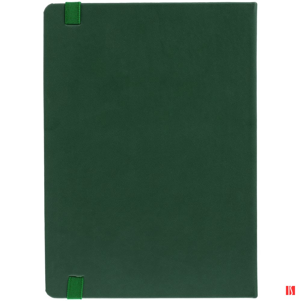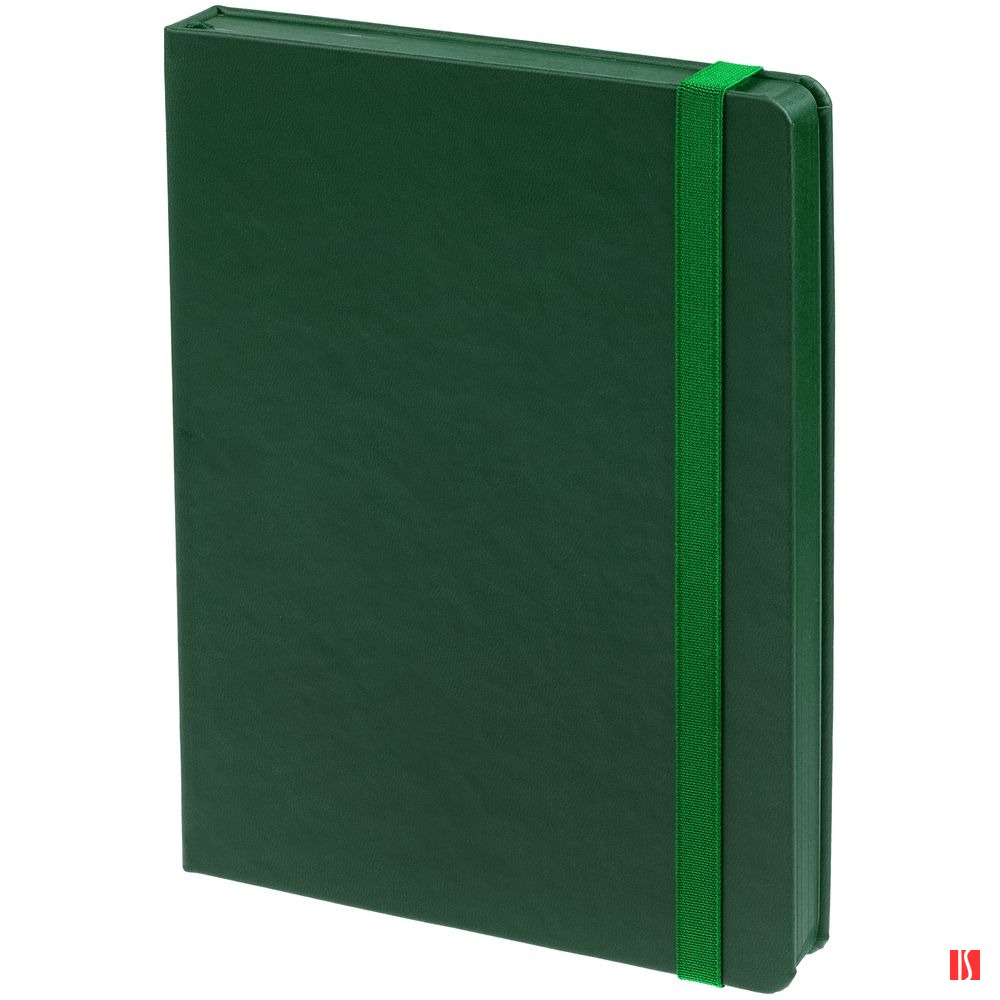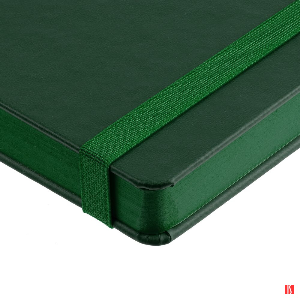 Ежедневник с твердой обложкой, выполнен из материала Latte, зеленый FF, обрез зеленого цвета, дополнен резинкой и ляссе зеленого цвета.