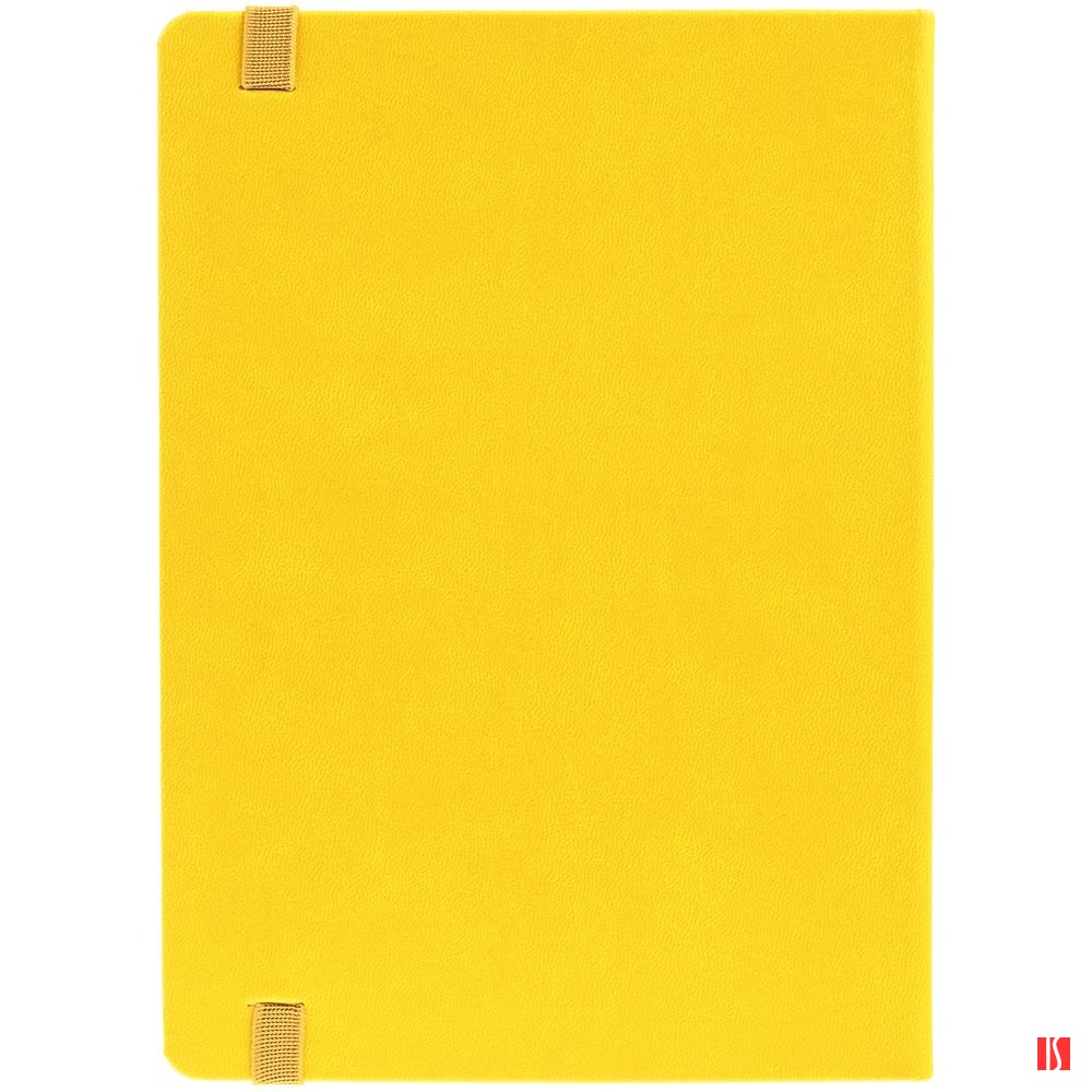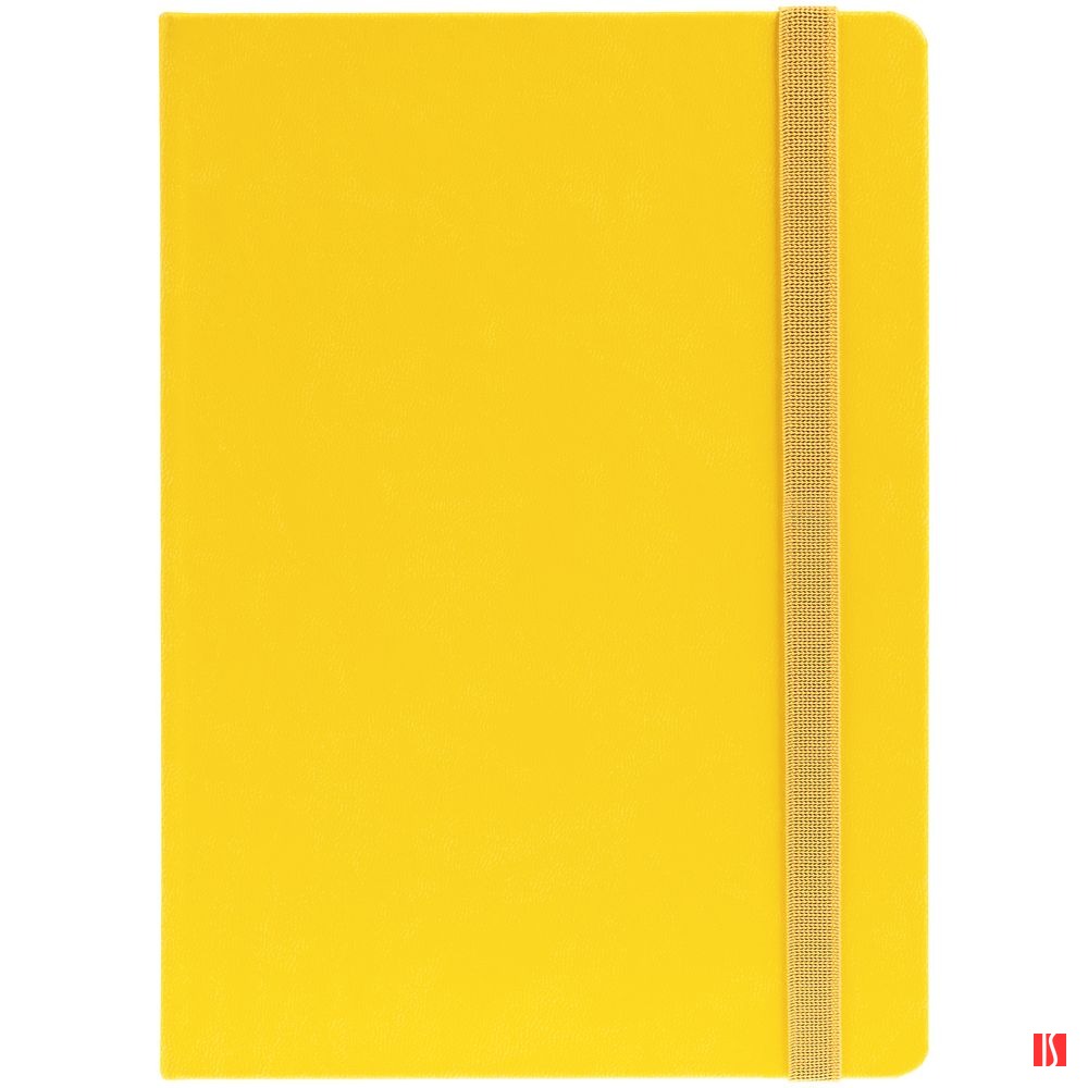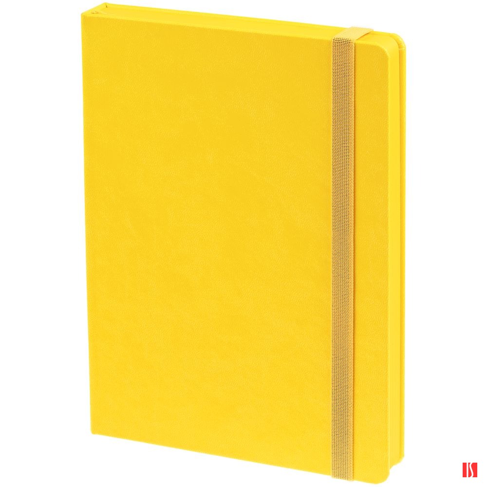 Ежедневник с твердой обложкой, выполнен из материала Latte, желтый КК, обрез зеленого цвета, дополнен резинкой и ляссе желтого цвета.