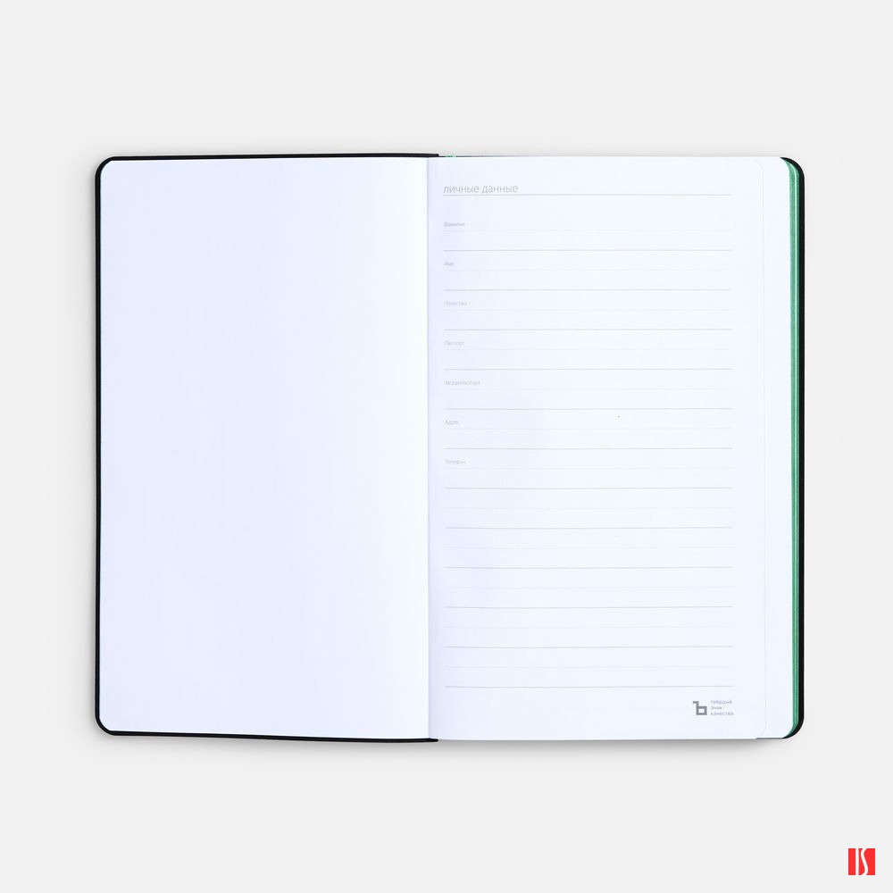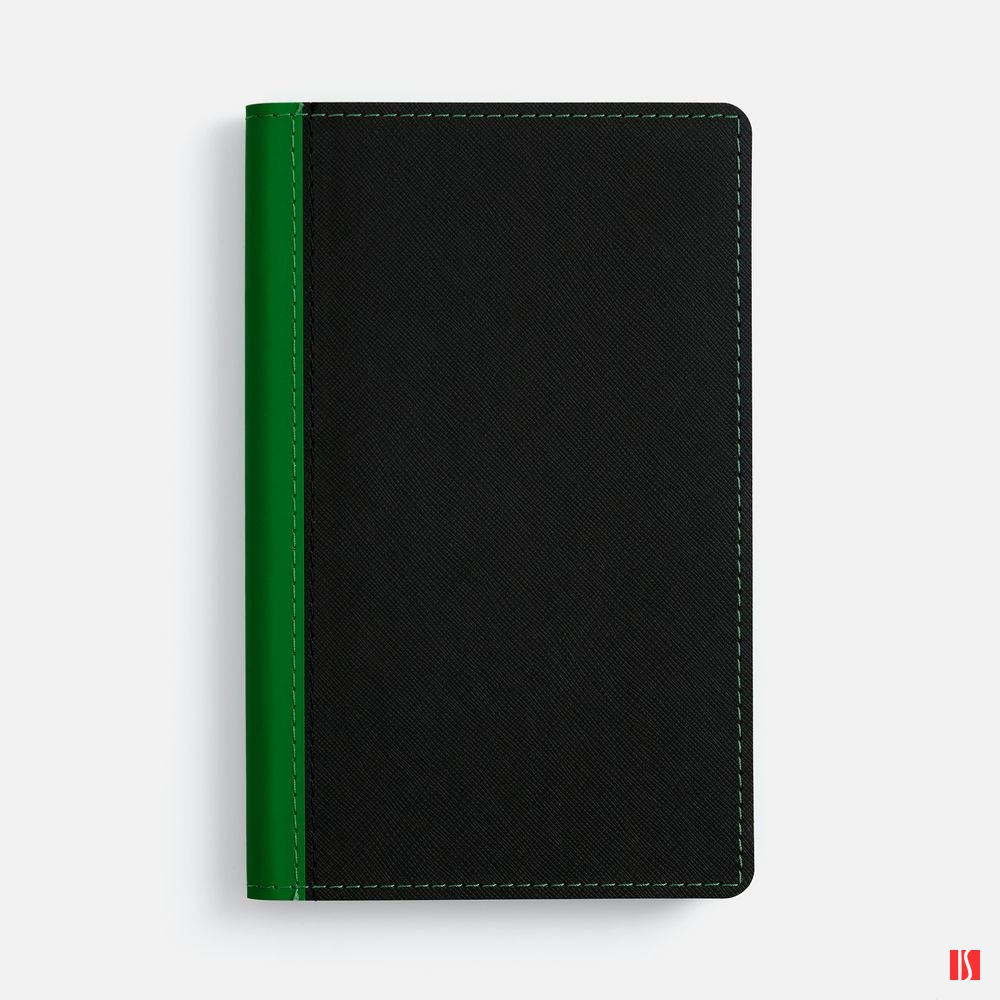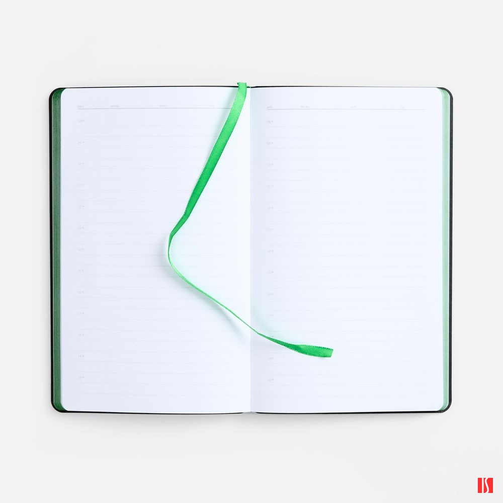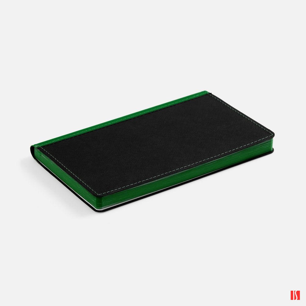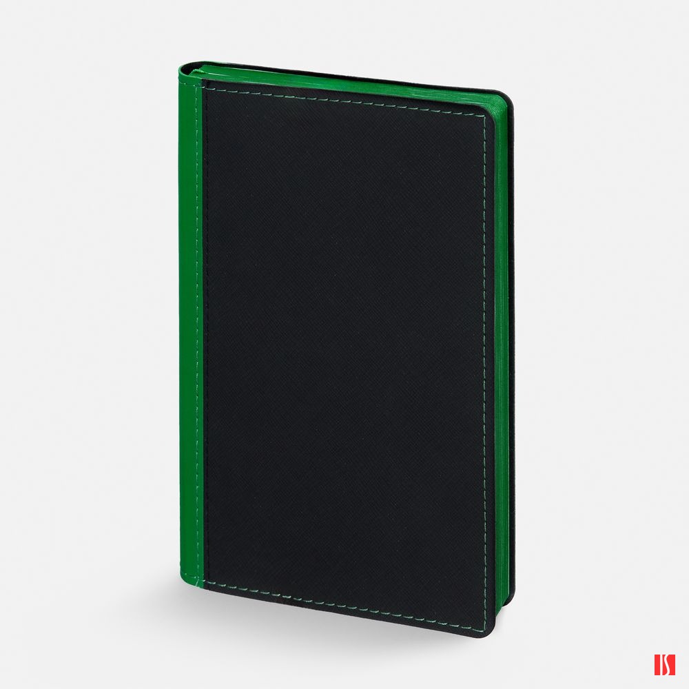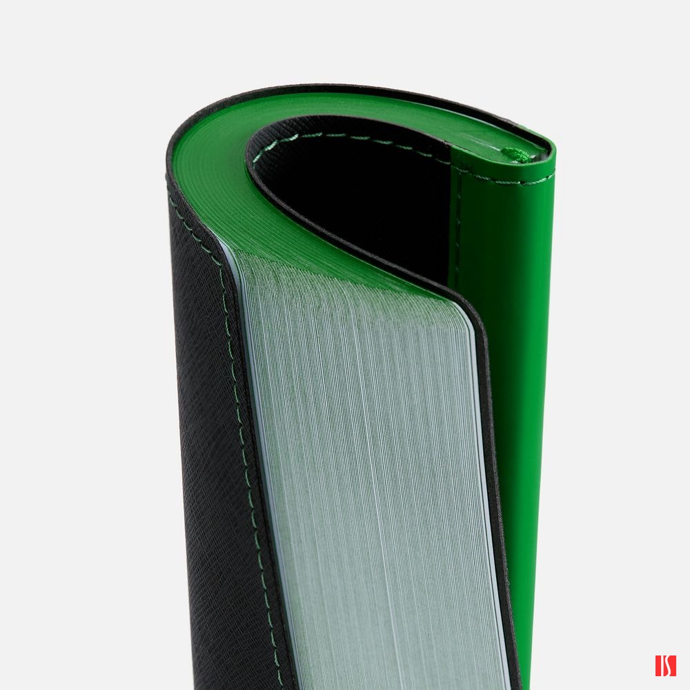 Ежедневник с гибкой обложкой выполнен из материала Nice Touch, черный АА и Soft Touch Ultra, зеленый FF, дополнен ляссе зеленого цвета.