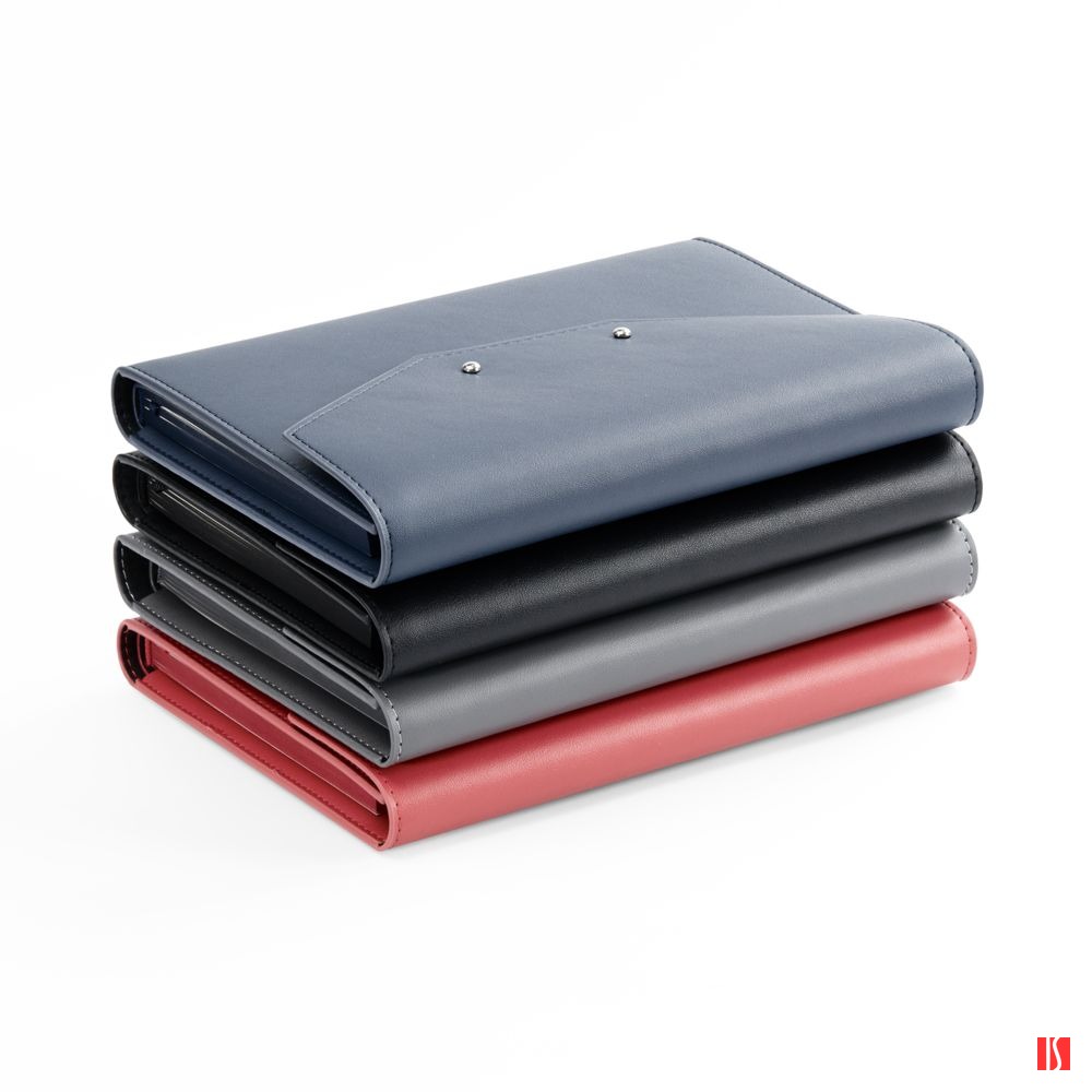 Ежедневник-органайзер в мягком переплете, формат А5+, с карманами для визиток и документов, петлей для ручки. Дополнен ляссе и капталом в цвет обложки. Клапан с прорезями застегивается на кобурные металлические кнопки.