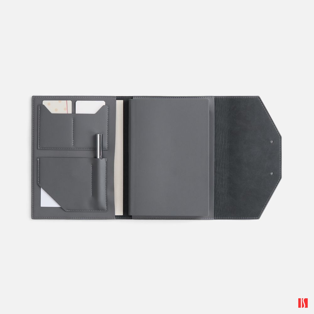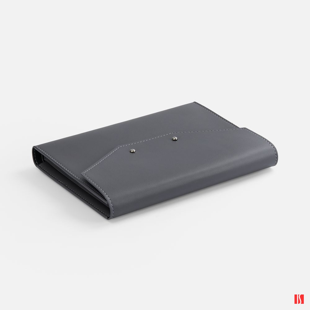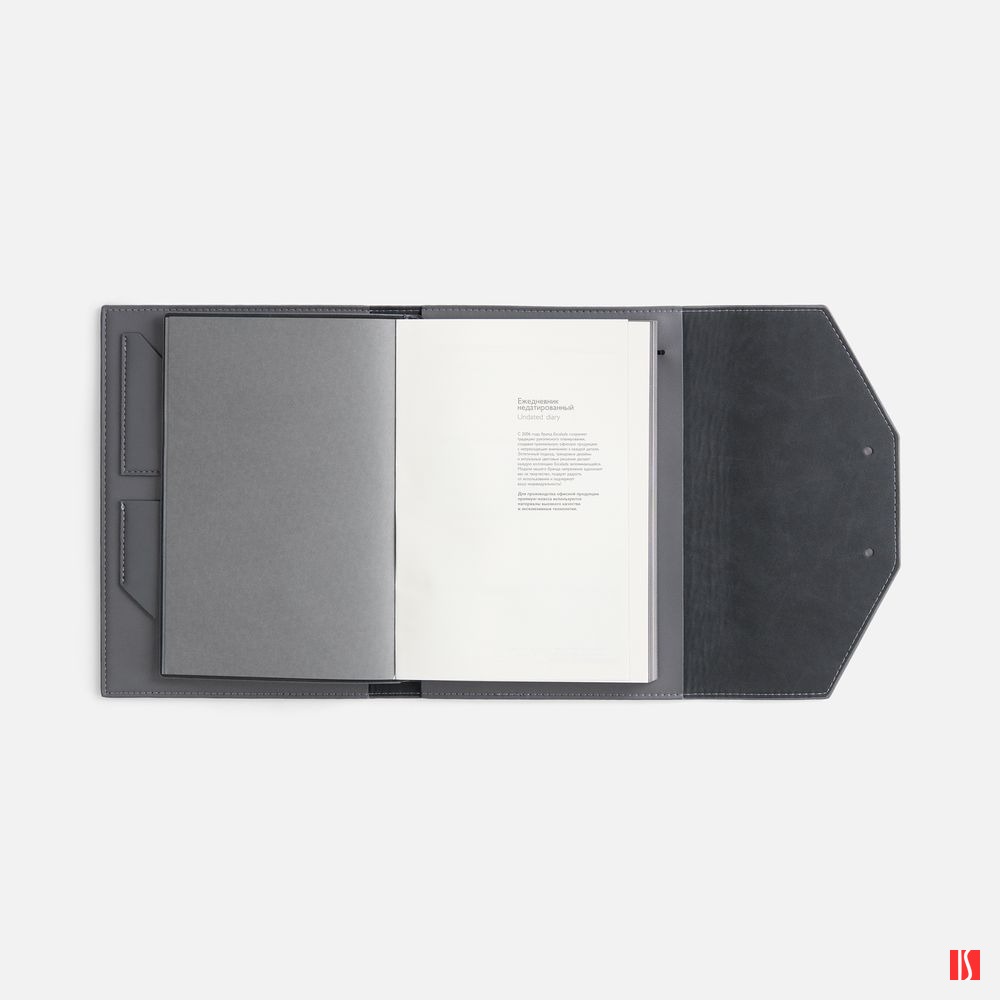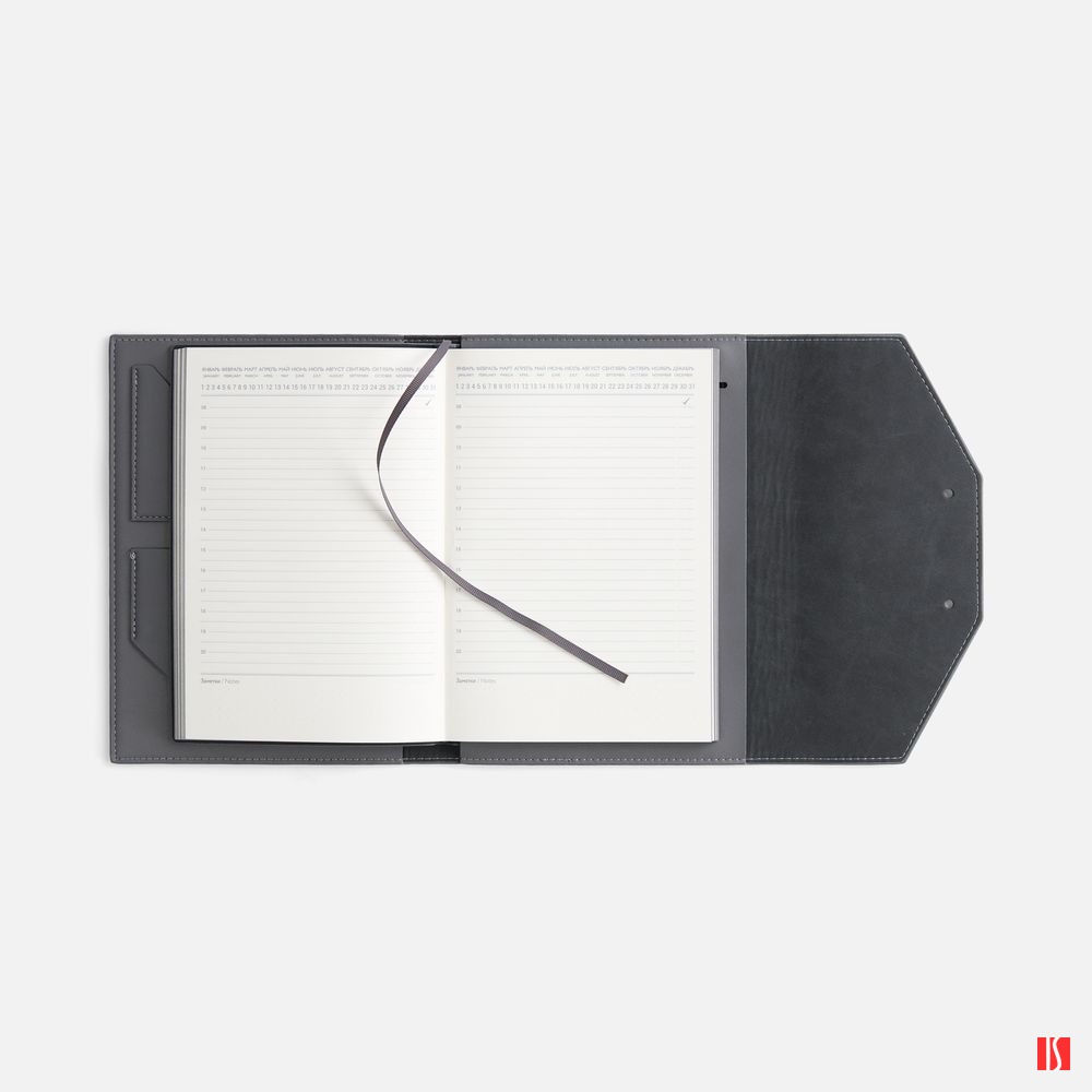 Ежедневник-органайзер в мягком переплете, формат А5+, с карманами для визиток и документов, петлей для ручки. Дополнен ляссе и капталом в цвет обложки. Клапан с прорезями застегивается на кобурные металлические кнопки.