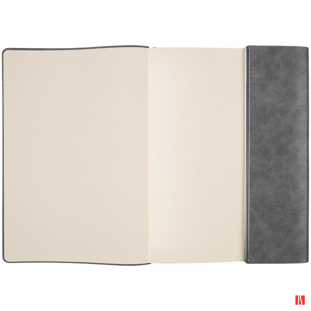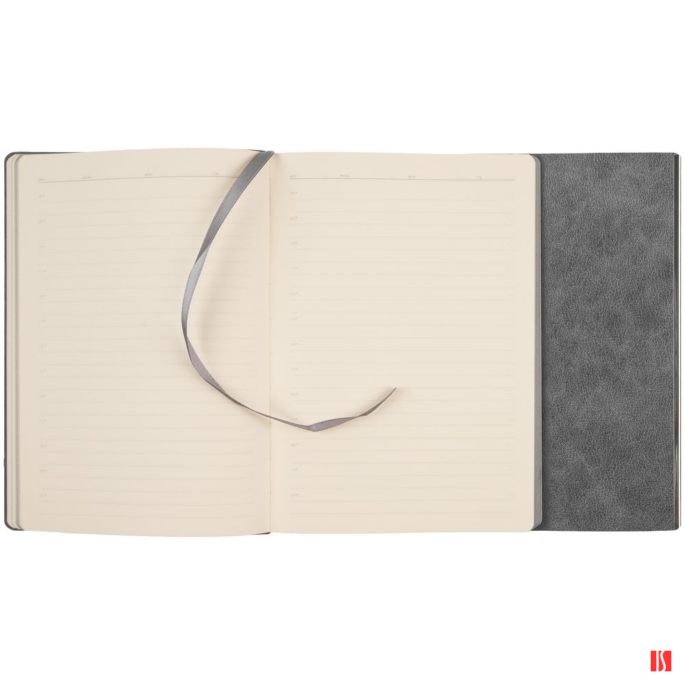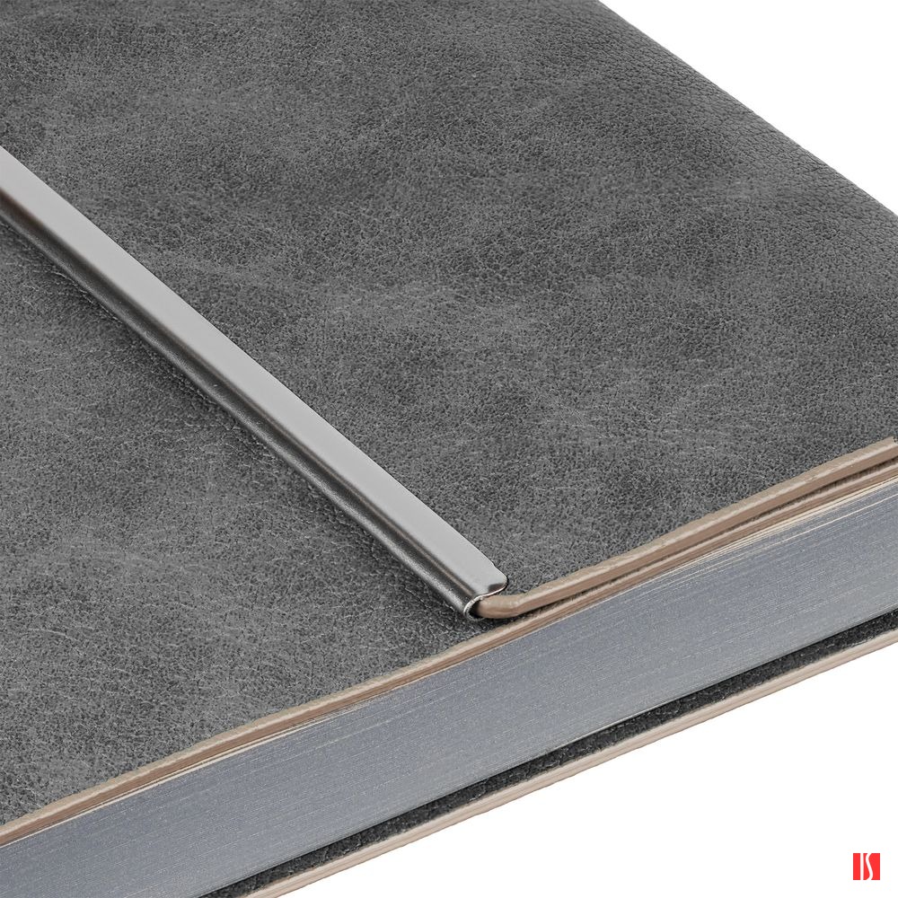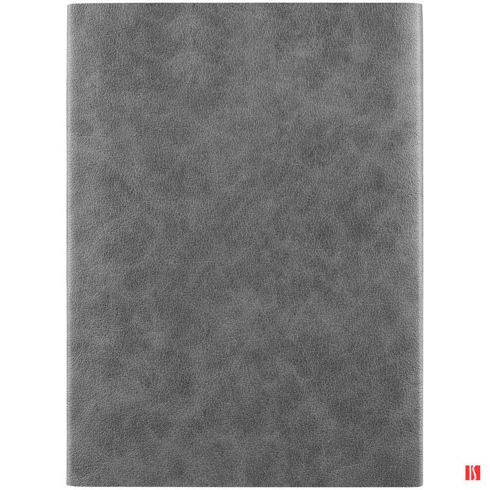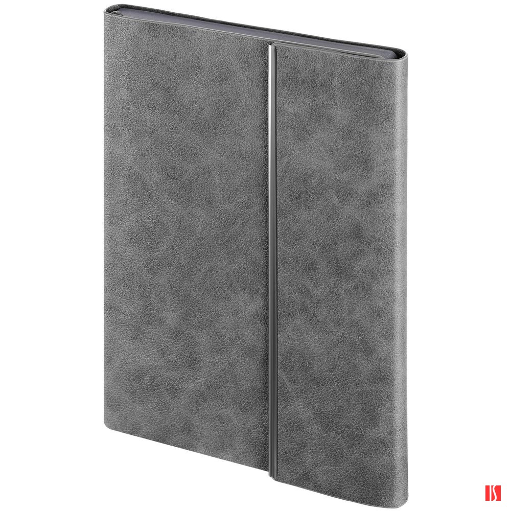 Ежедневник с гибкой обложкой, клапаном на магните и металлической отделкой клапана. Выполнен из материала Petrus, серый СС, дополнен серым ляссе.
