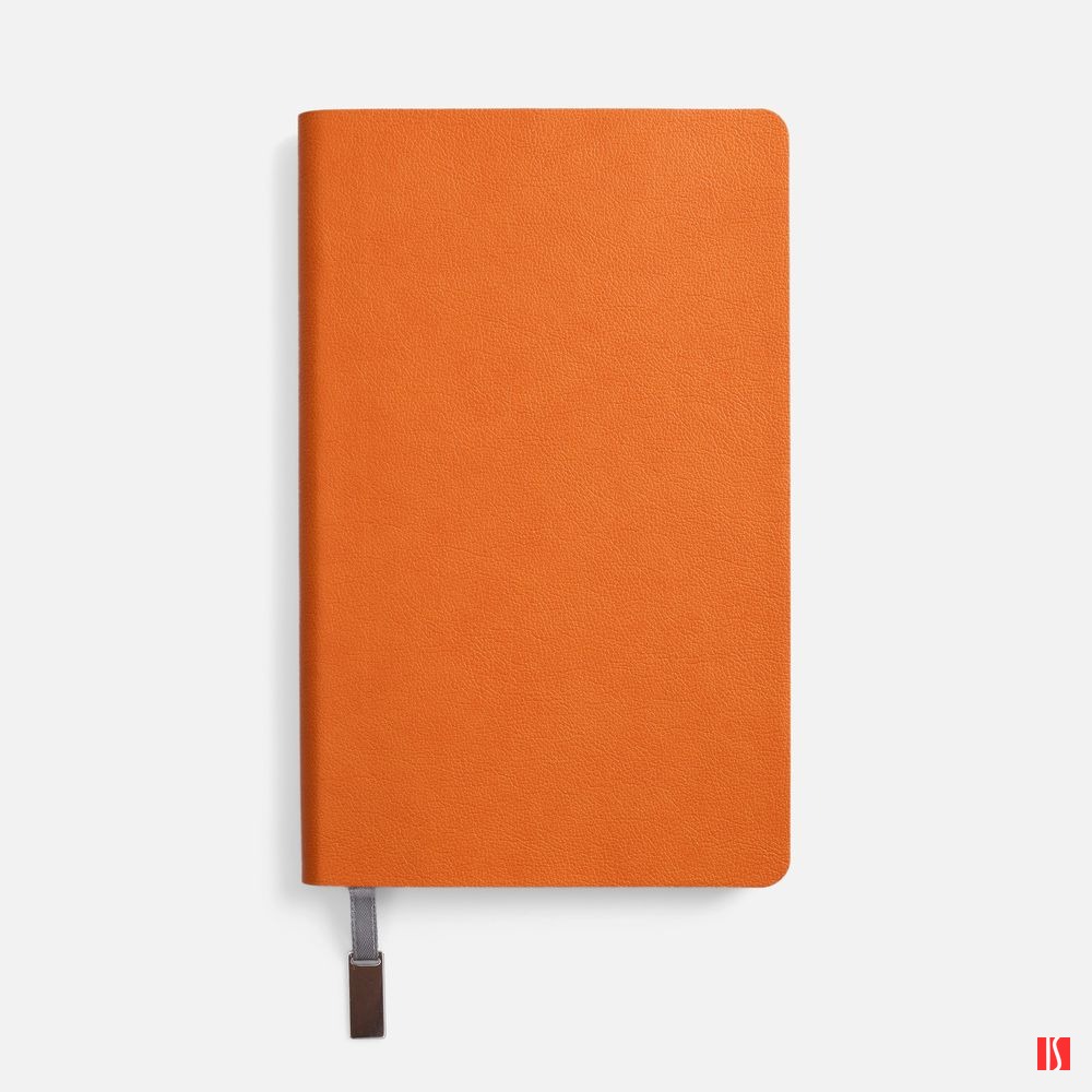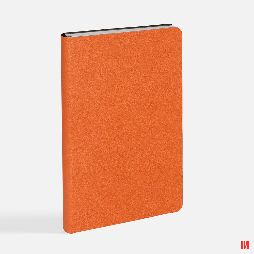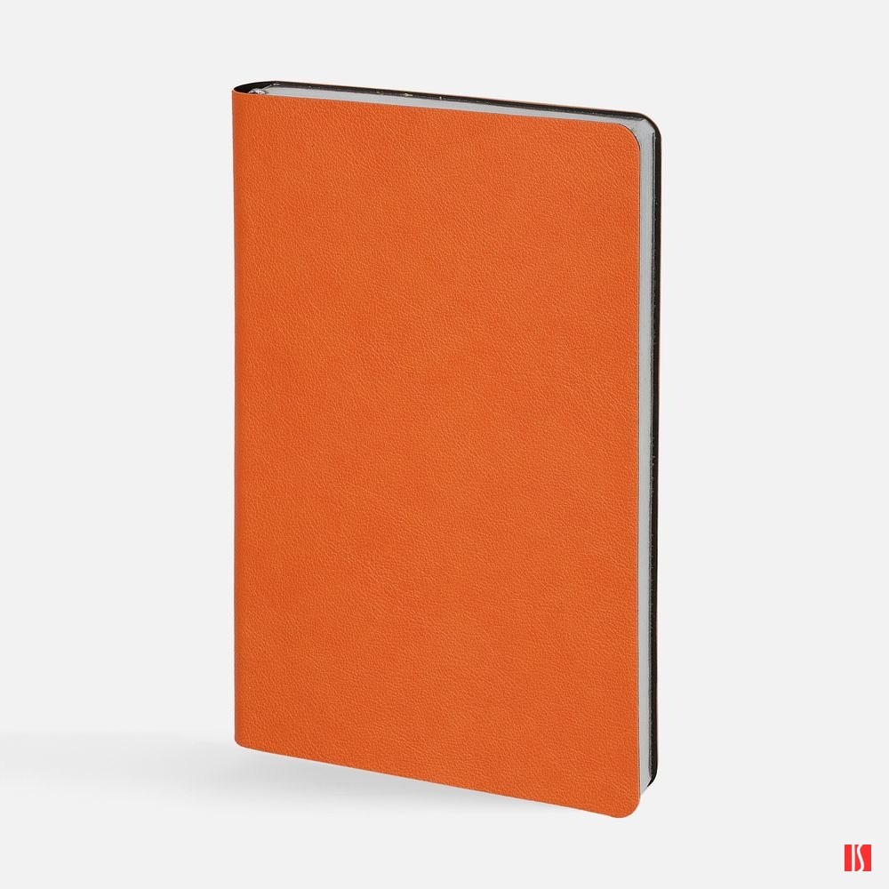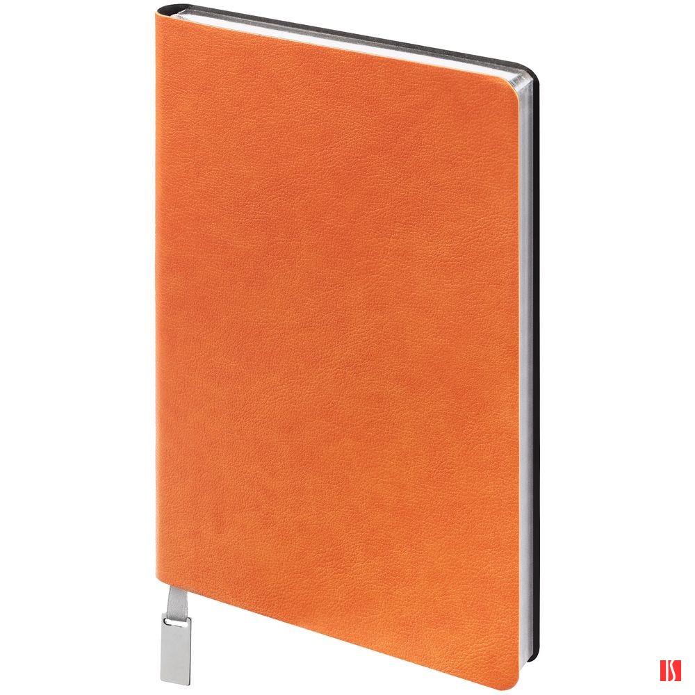 Ежедневник с гибкой обложкой, выполнен из материала Petrus, оранжевый ОО, дополнен серым ляссе с металлическим шильдиком.