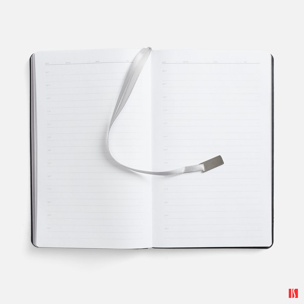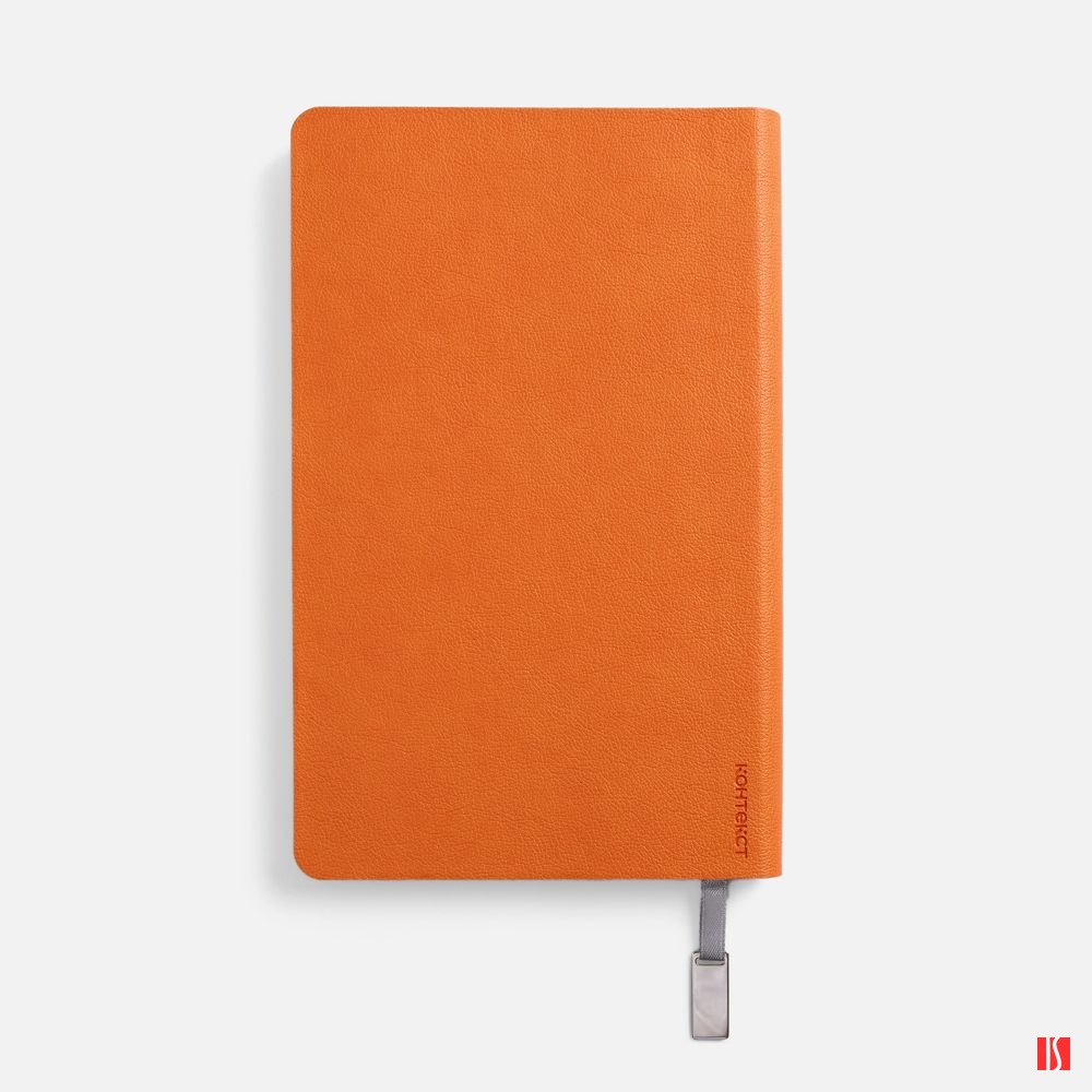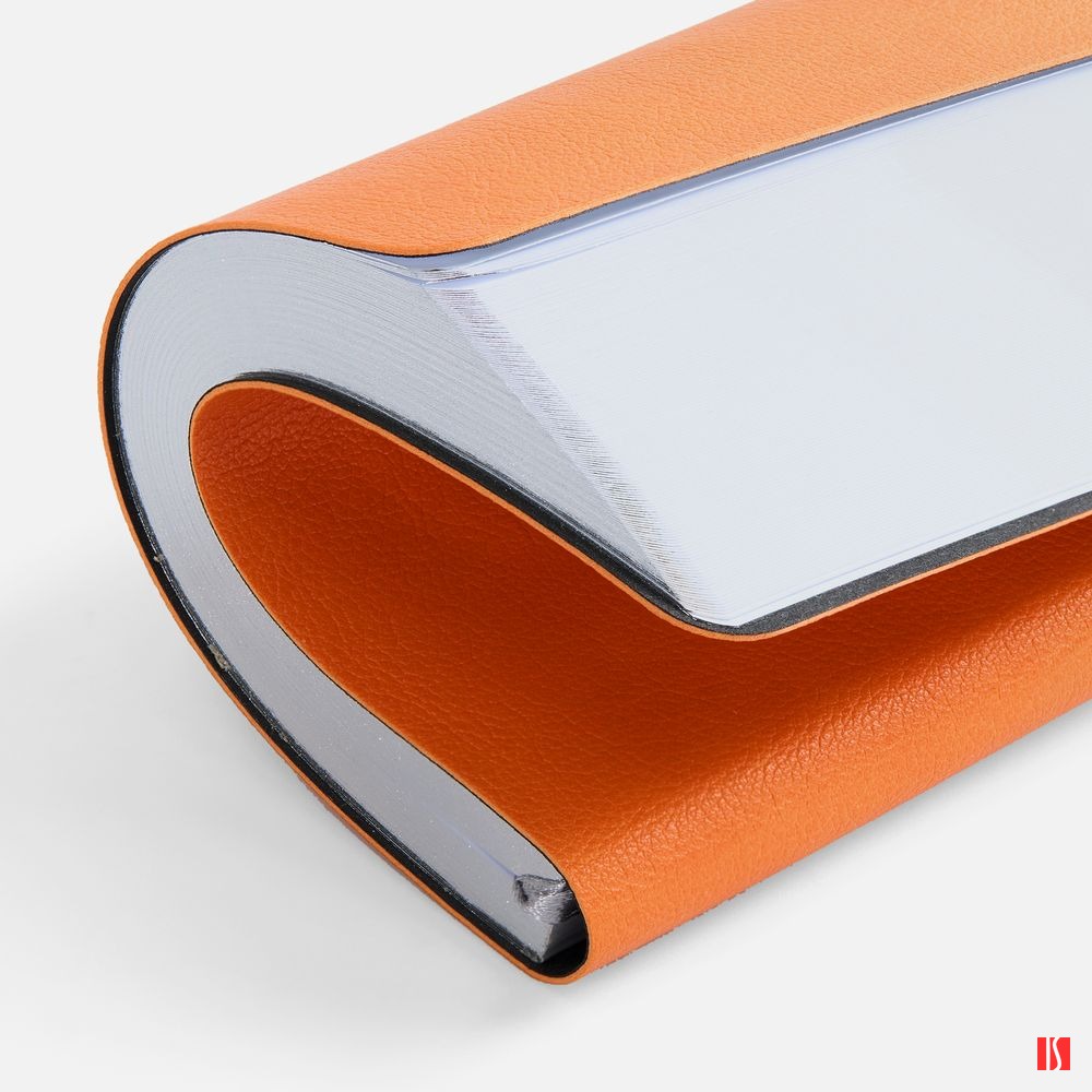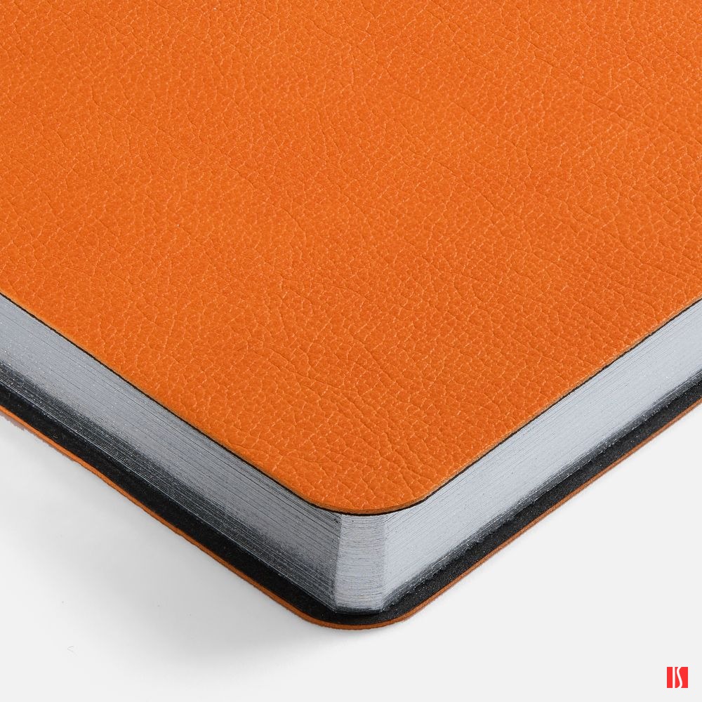 Ежедневник с гибкой обложкой, выполнен из материала Petrus, оранжевый ОО, дополнен серым ляссе с металлическим шильдиком.