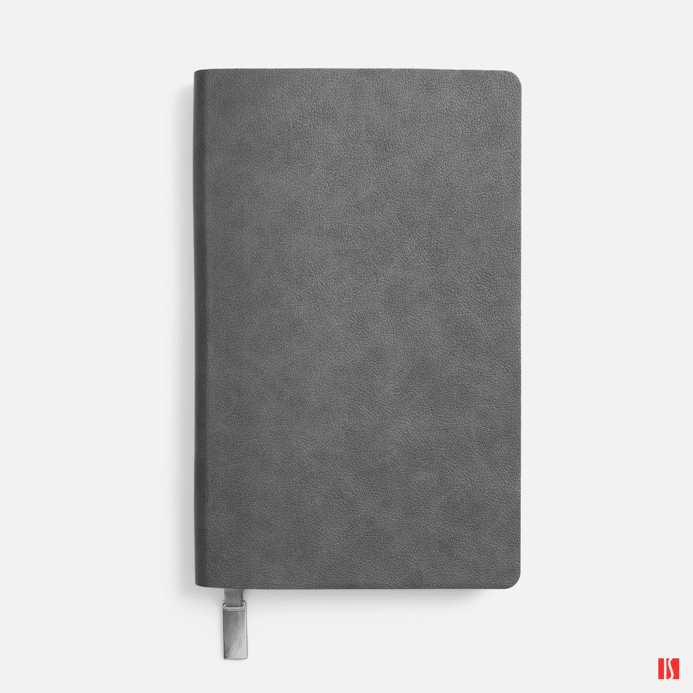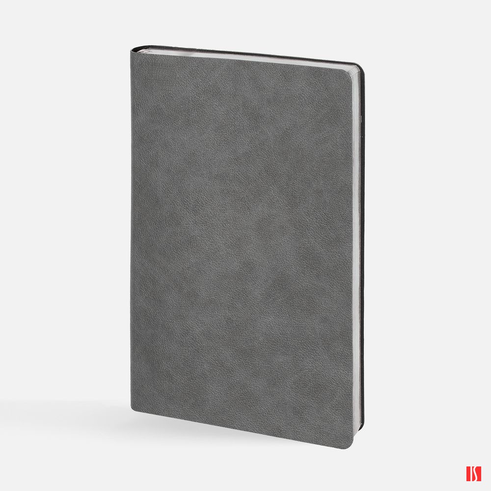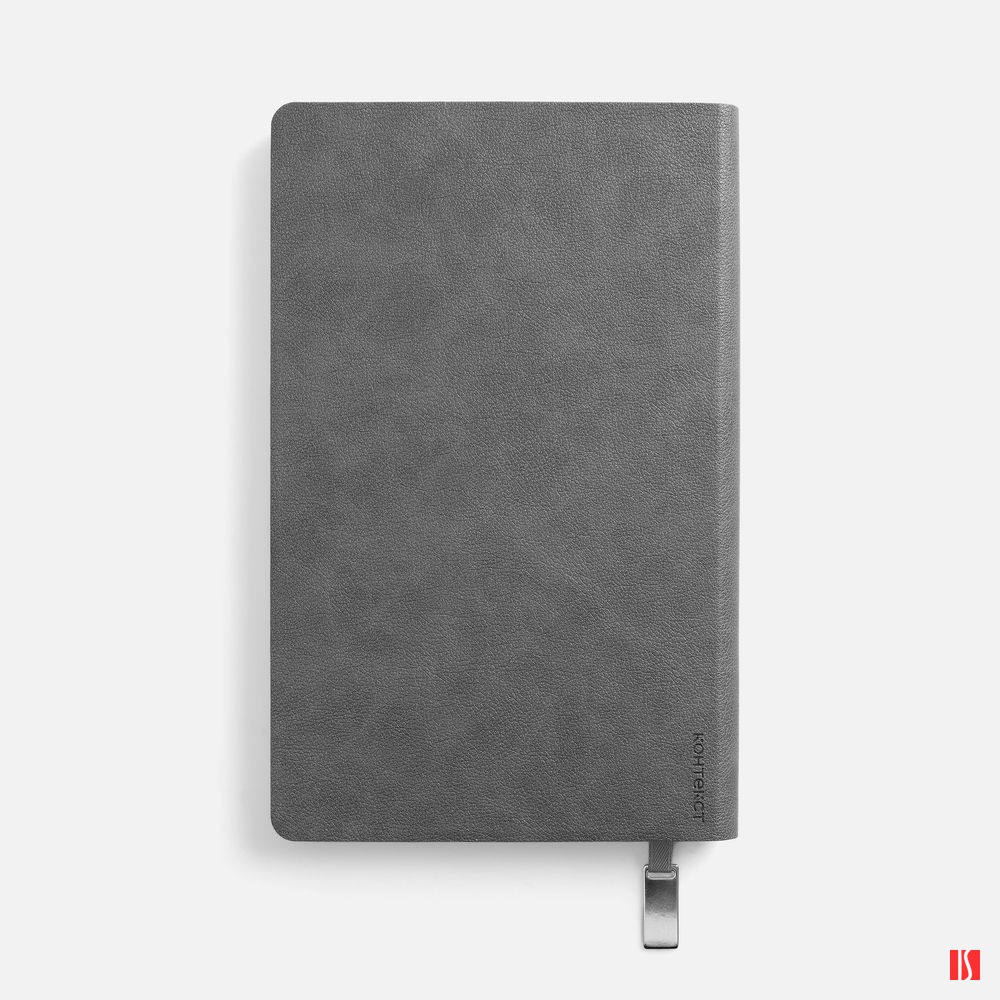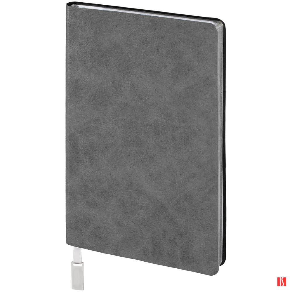 Ежедневник с гибкой обложкой, выполнен из материала Petrus, серый СС, дополнен серым ляссе с металлическим шильдиком.