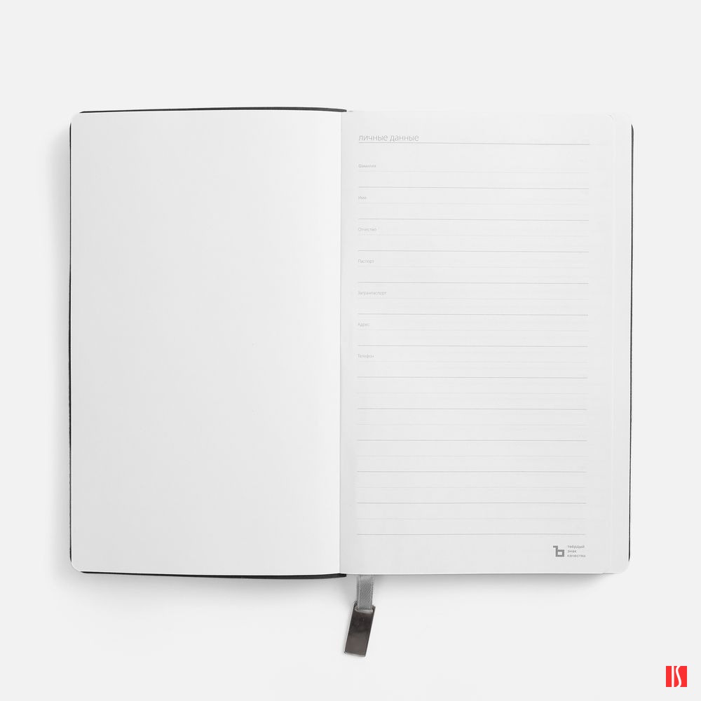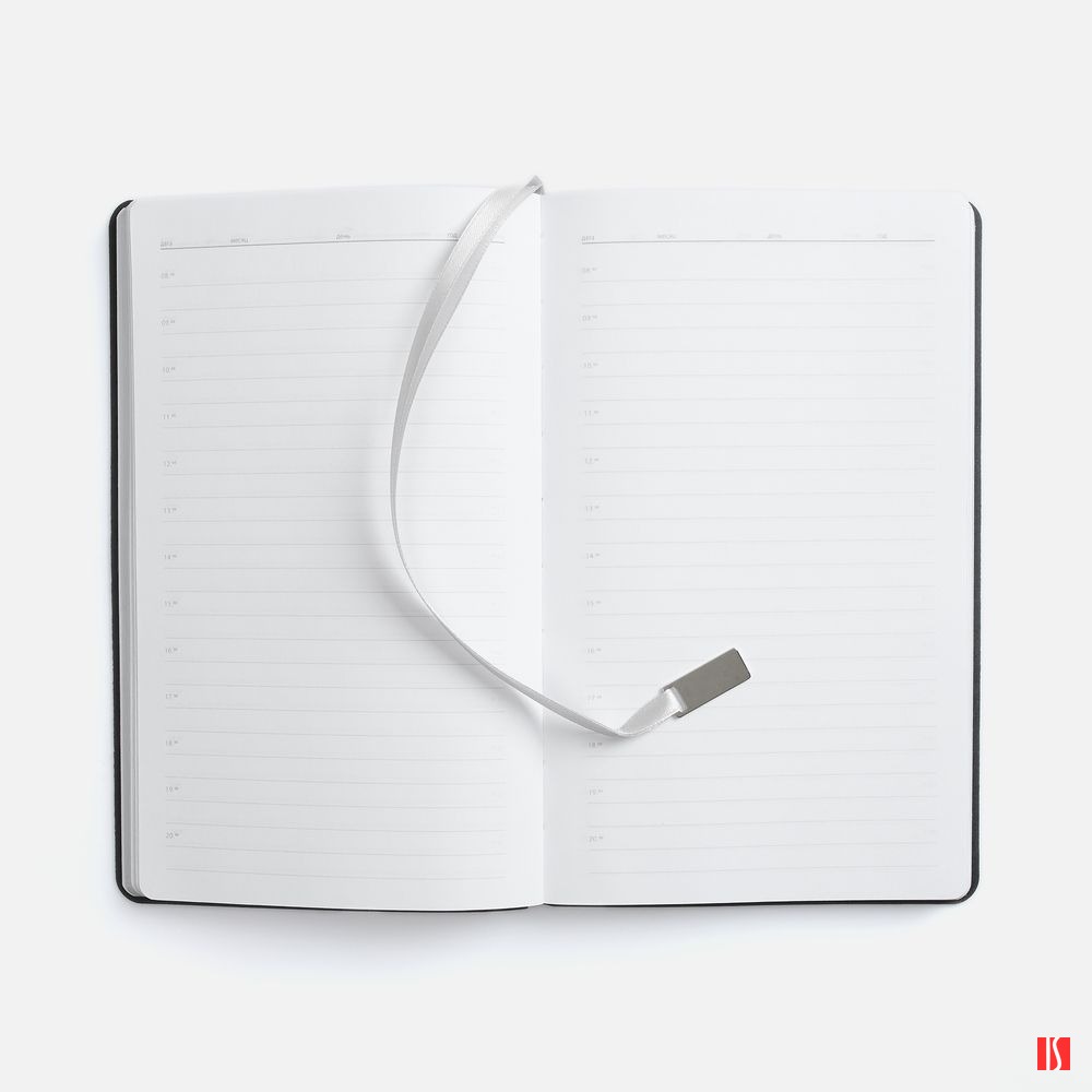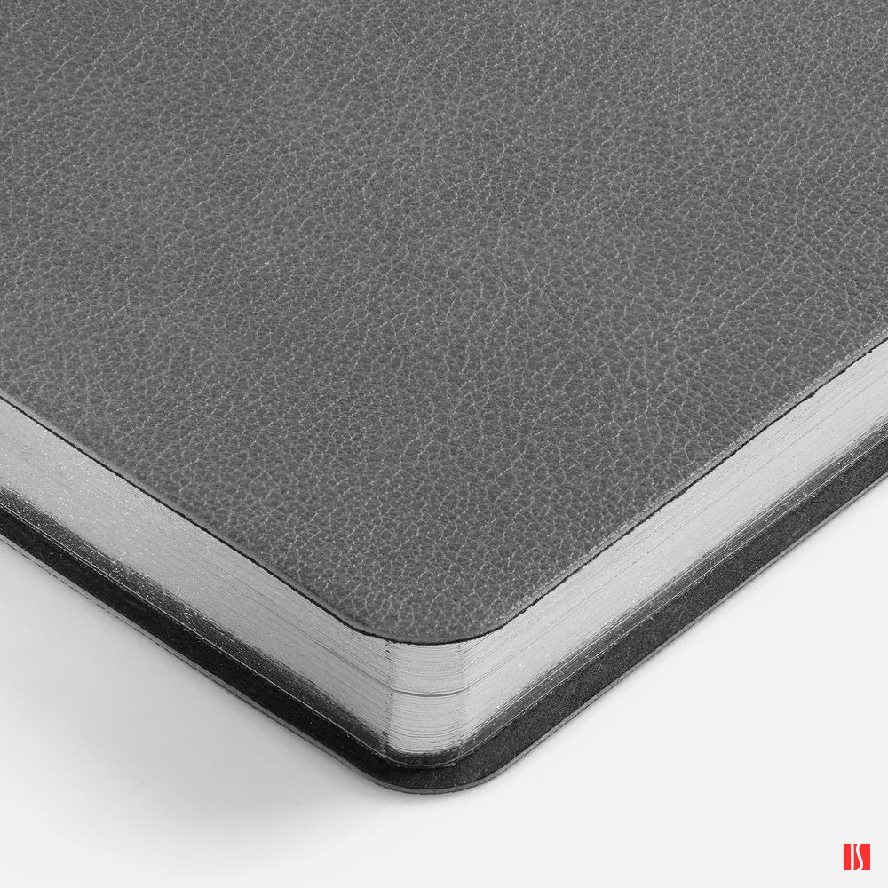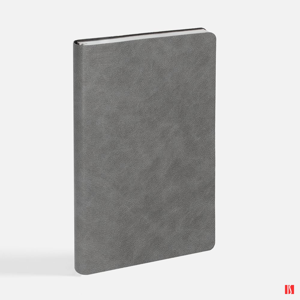 Ежедневник с гибкой обложкой, выполнен из материала Petrus, серый СС, дополнен серым ляссе с металлическим шильдиком.