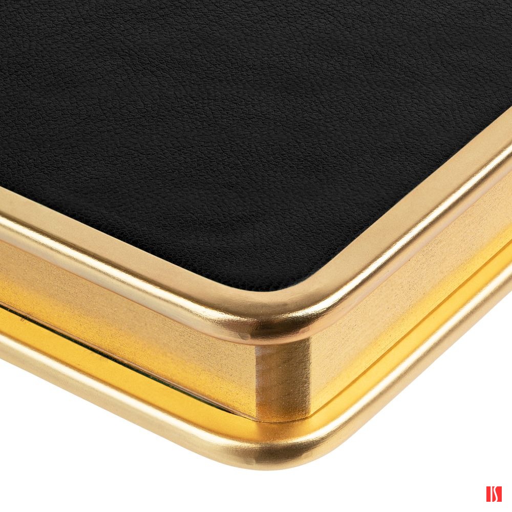 Твердая обложка с металлической окантовкой. Металлизированный обрез блока.