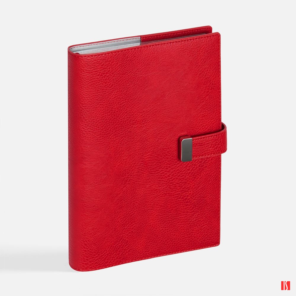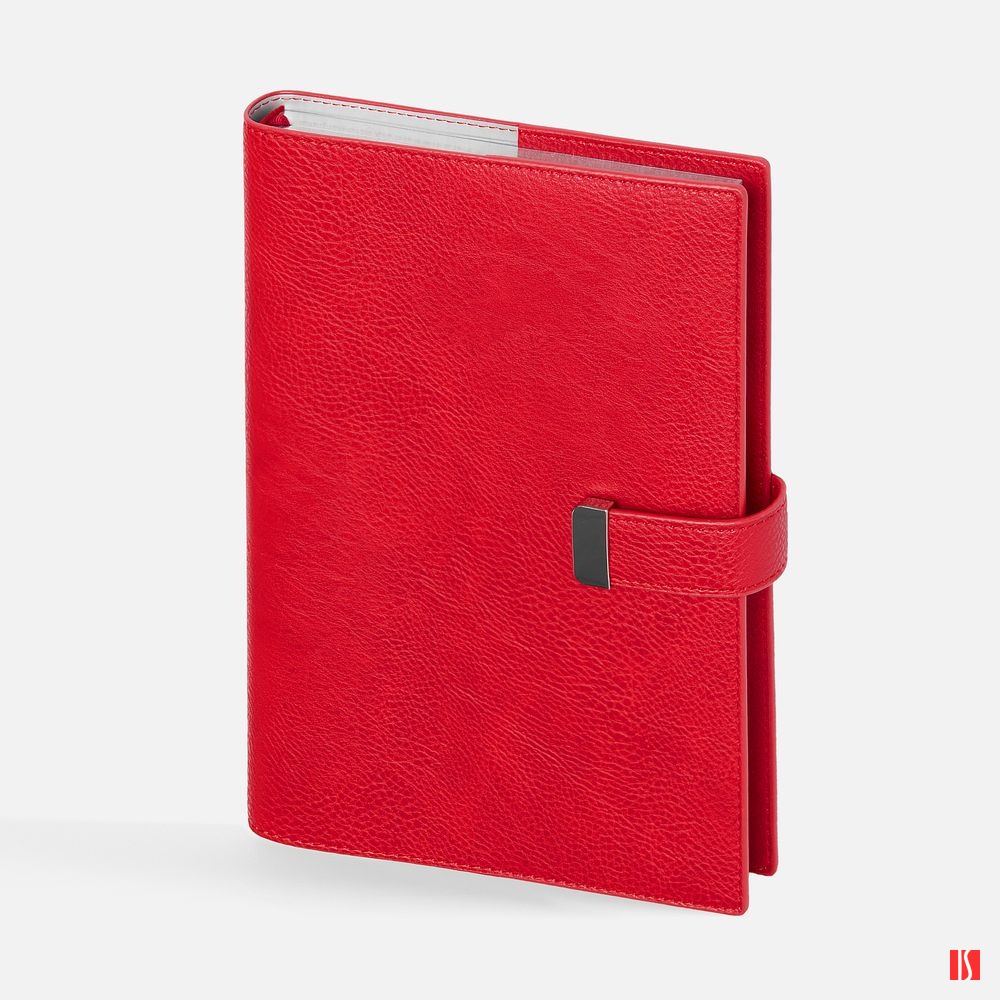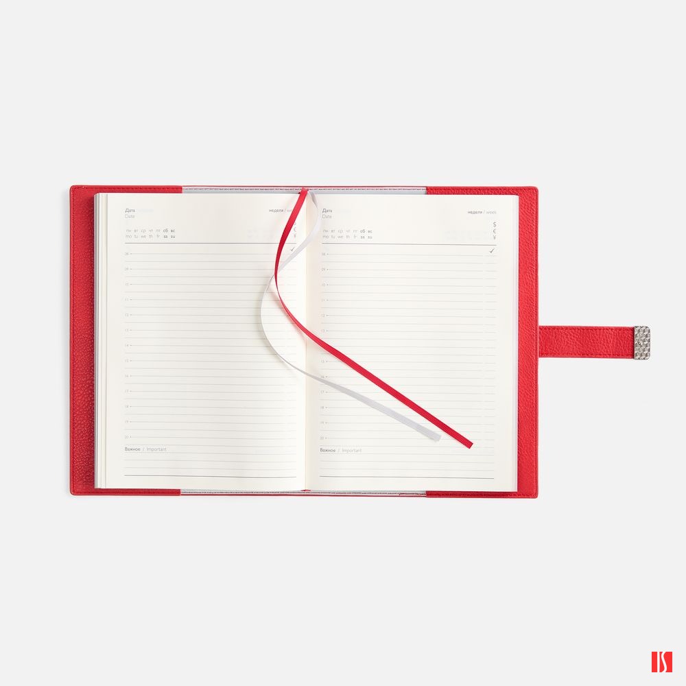 Ежедневник в мягком переплете со съемной обложкой, дополнен застежкой-хлястиком с металлическим шильдом на кнопке, двойным ляссе и капталом.